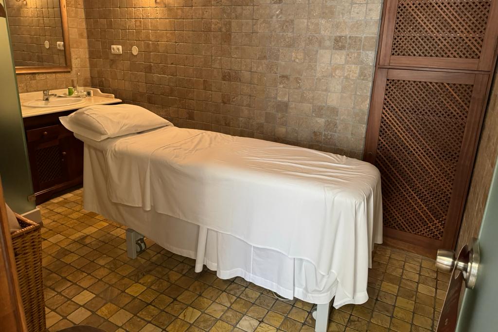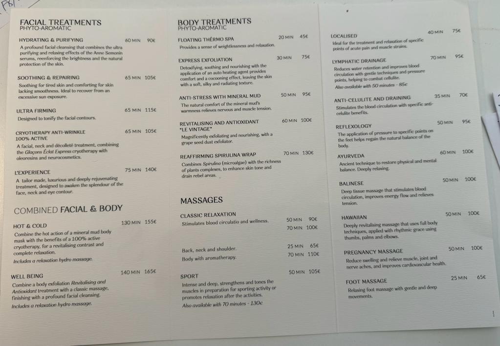 The hotel features indoor and outdoor pools, a sauna, and a Turkish steam bath, all free for guests to use. Various wellness treatments are also available, including a Balinese massage (€100).