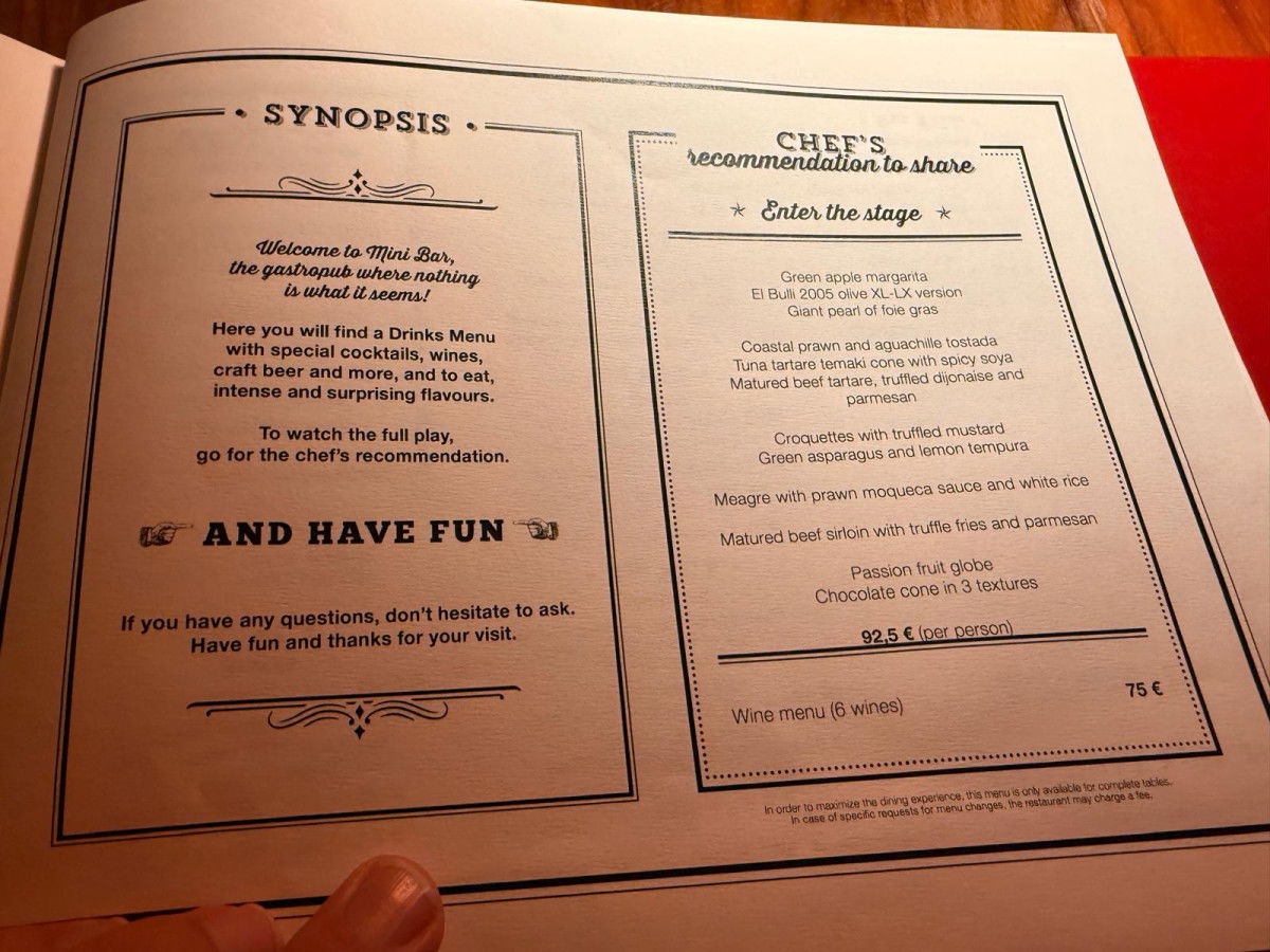 Hidden behind a red theatrical door lies an entirely different world: Mini Bar – Cabaret Gourmet. Deep red tones, dim lights, velvet, shadows and a speakeasy mood. It feels like a Parisian underground club — Moulin Rouge meets contemporary gastronomy.