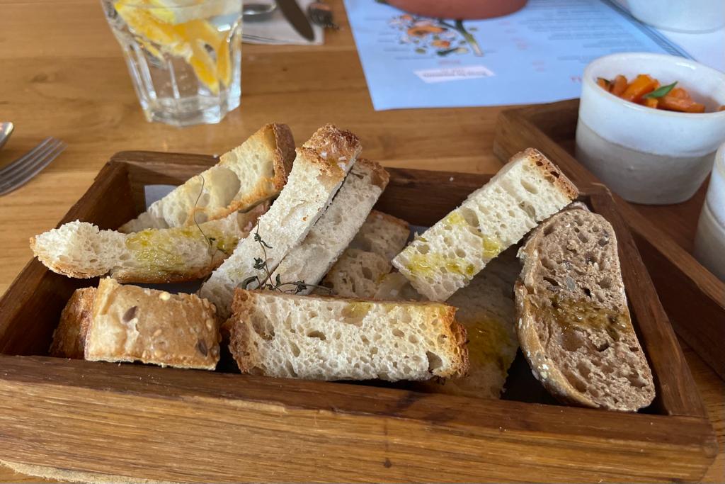 To begin our dining experience, I opted for a delicious and full-bodied red wine, the Vila Santa Tinto, while my companion enjoyed a refreshing glass of fresh orange juice. Our taste buds were further delighted by the place settings, which included bread accompanied by olive oil and a delightful Portuguese bean hummus. The combination was a delightful start to our meal. For my companion, who follows a gluten-free diet, gluten-free bread was thoughtfully provided.