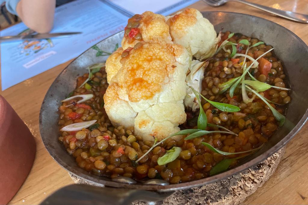 For the main course, I ventured into the realm of roasted aubergine, accompanied by sautéed mushrooms, fresh herbs, pumpkin, and carrot puree. As someone who is not particularly fond of aubergine, I was pleasantly surprised by how fantastic this dish turned out. The flavors were harmonious, and I can confidently say that it is a dish I would gladly be woken up for. My companion opted for lentils with grilled cauliflower, and while the flavors were enjoyable, they felt that the dish was slightly undercooked, which hindered the blending of flavors.