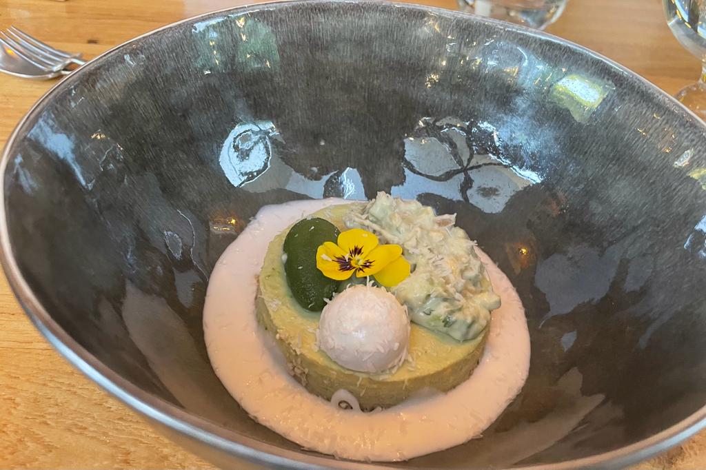 When it came time for dessert, I decided to step out of my comfort zone and ordered an avocado-based treat. Avocado is not typically associated with desserts in my mind, often being reserved for avocado toast or cocktails. However, the avocado tartlet, infused with lime and coconut, accompanied by sorbet ice cream and a mint dressing, was a revelation. It was a unique and delicious combination that I thoroughly enjoyed. On the other hand, my companion, who adores red fruits, chose the refreshing watermelon, which was a perfect choice to conclude the meal on a light and refreshing note.