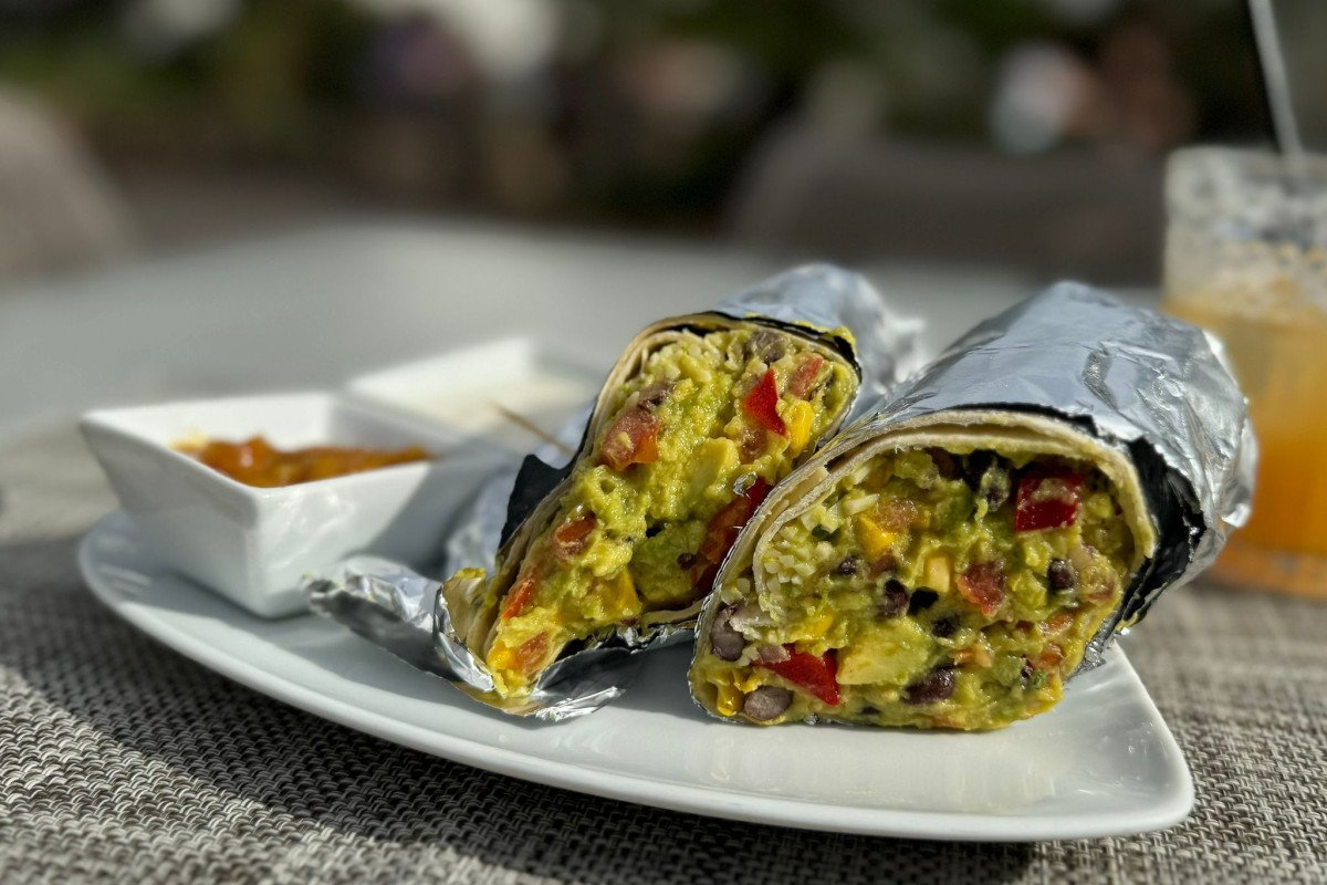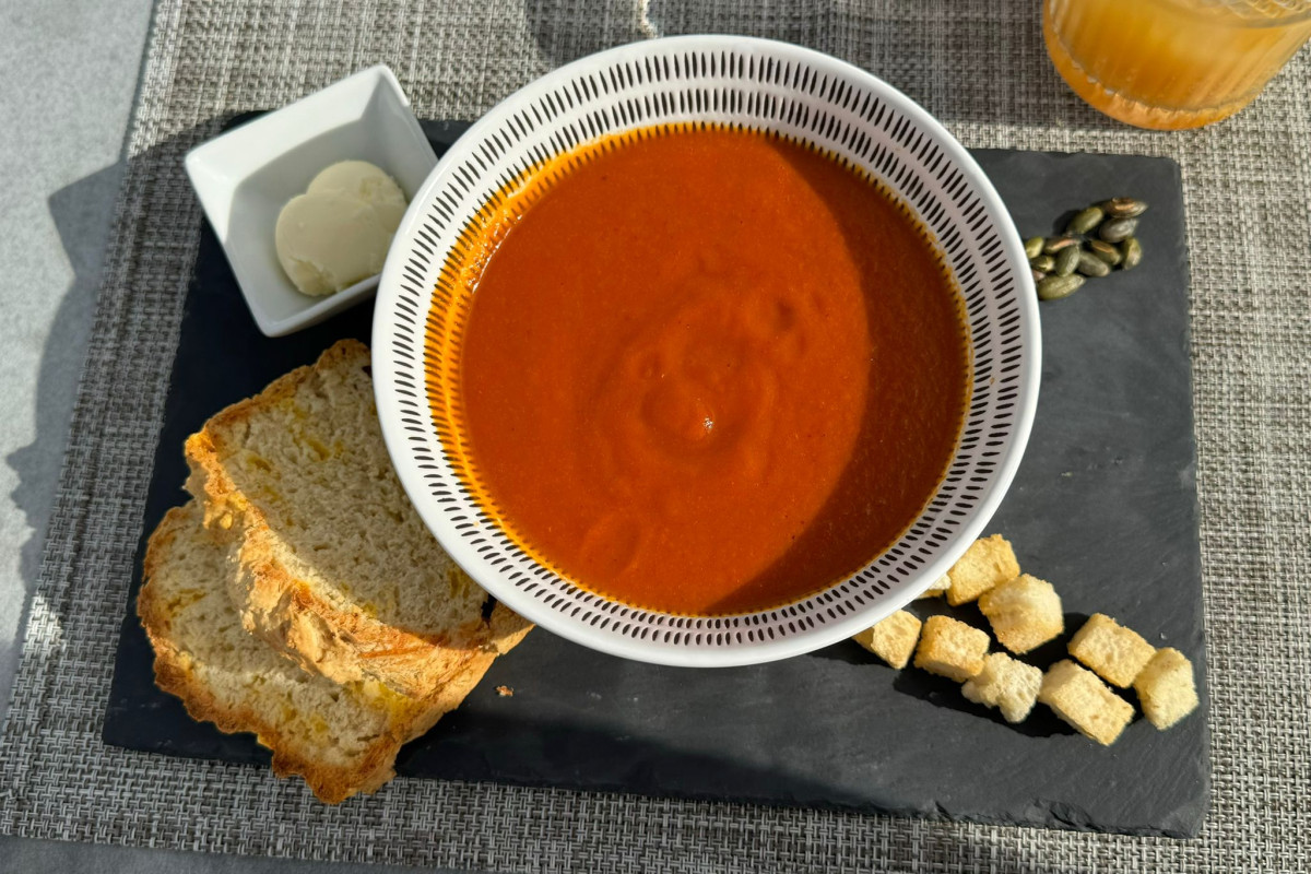 The lunch options are equally enticing, with choices like Toast avocado (6.50), Banana pancake (8 euros), 2 Burritos with sauces (8.80 euros), or a generous bowl of Romesco soup with bread and butter (6.50).