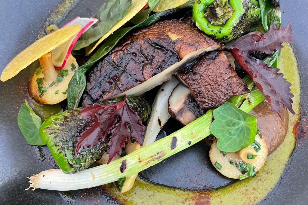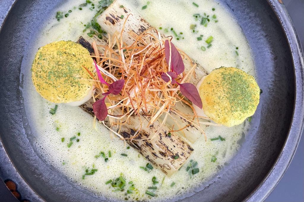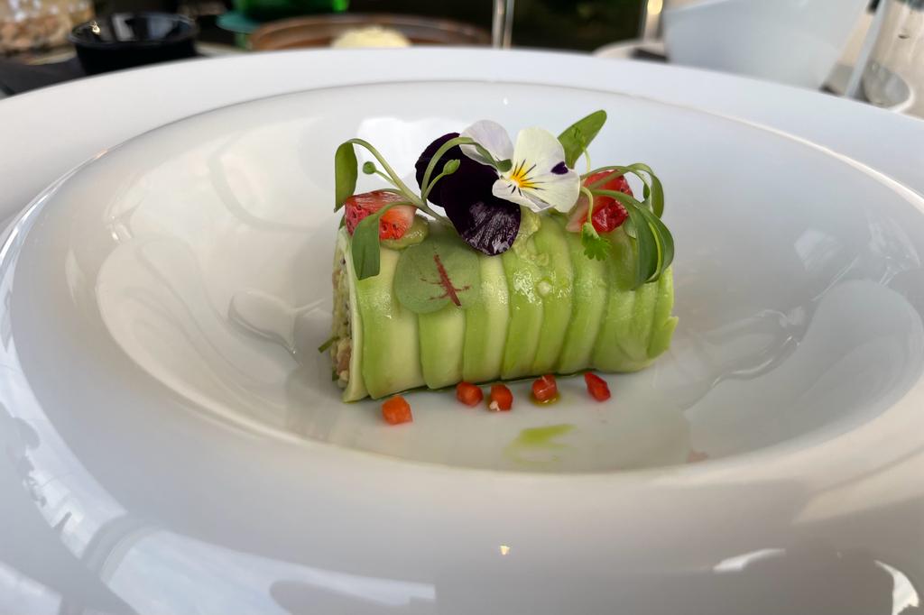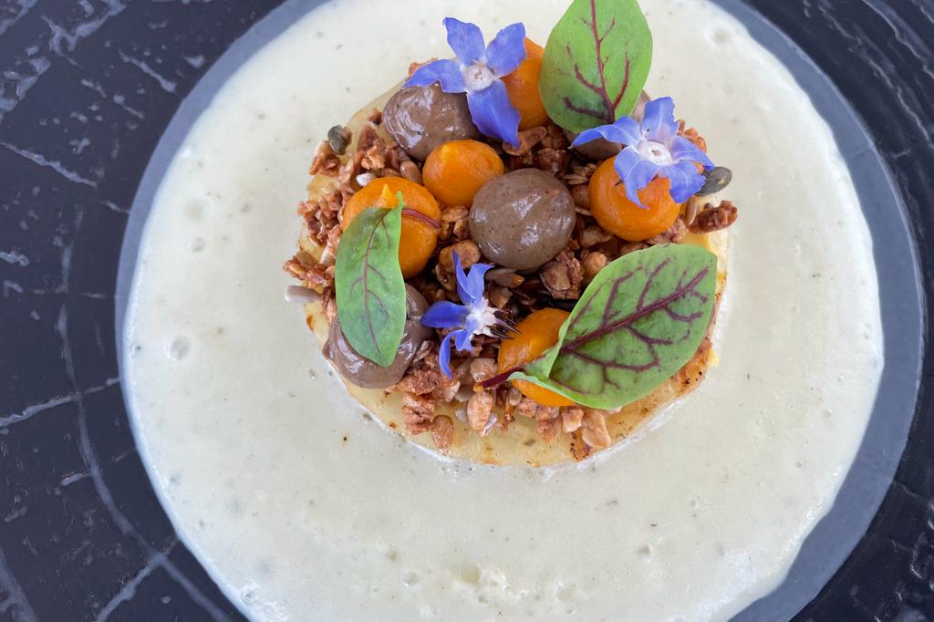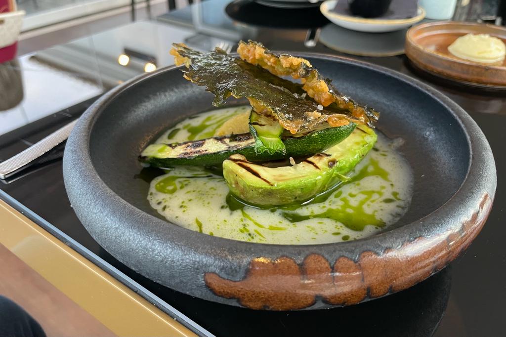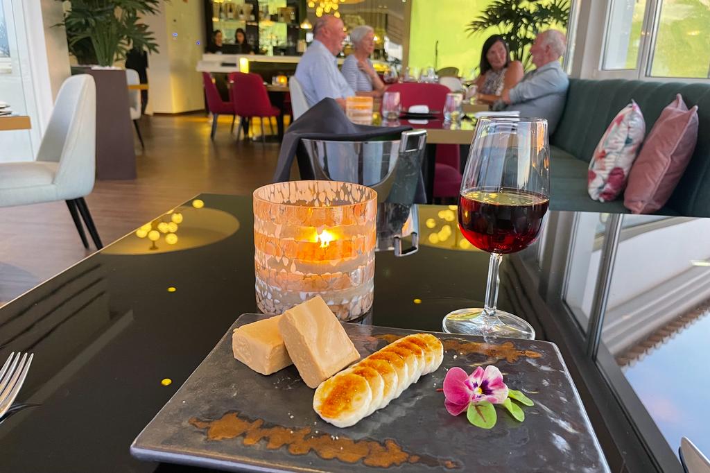 Main courses like roasted avocado and courgette with apple sauce continue to impress with both presentation and palate-pleasing appeal. The dessert, featuring coconut and peanut ice cream with banana, is a daring yet delightful finale, harmonized perfectly with a 20-year-old Port.
