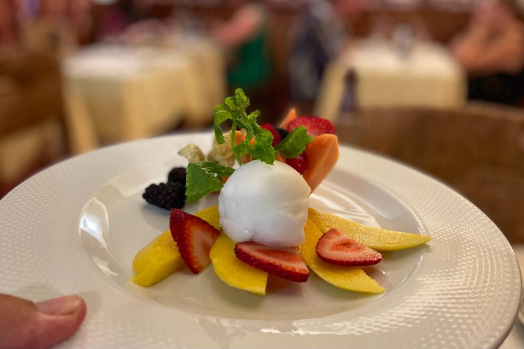 And for dessert, we indulged in lime sorbet ice cream accompanied by a vibrant assortment of fresh fruits—truly a feast for the eyes. From papaya to blackberries, mango, red currant, and strawberries, it was a delectable masterpiece!