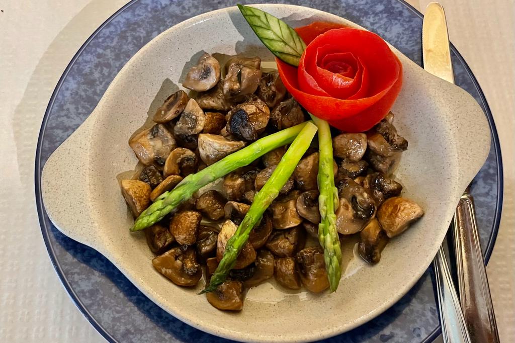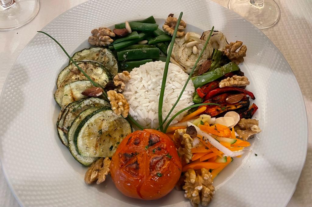 As our main course, we savored a dish featuring rice, sautéed vegetables, and an assortment of nuts. Often, chefs overlook the fact that vegetarian and vegan options still require protein, such as nuts, lentils, chickpeas, beans, or tofu. But these talented chefs take care of such details!