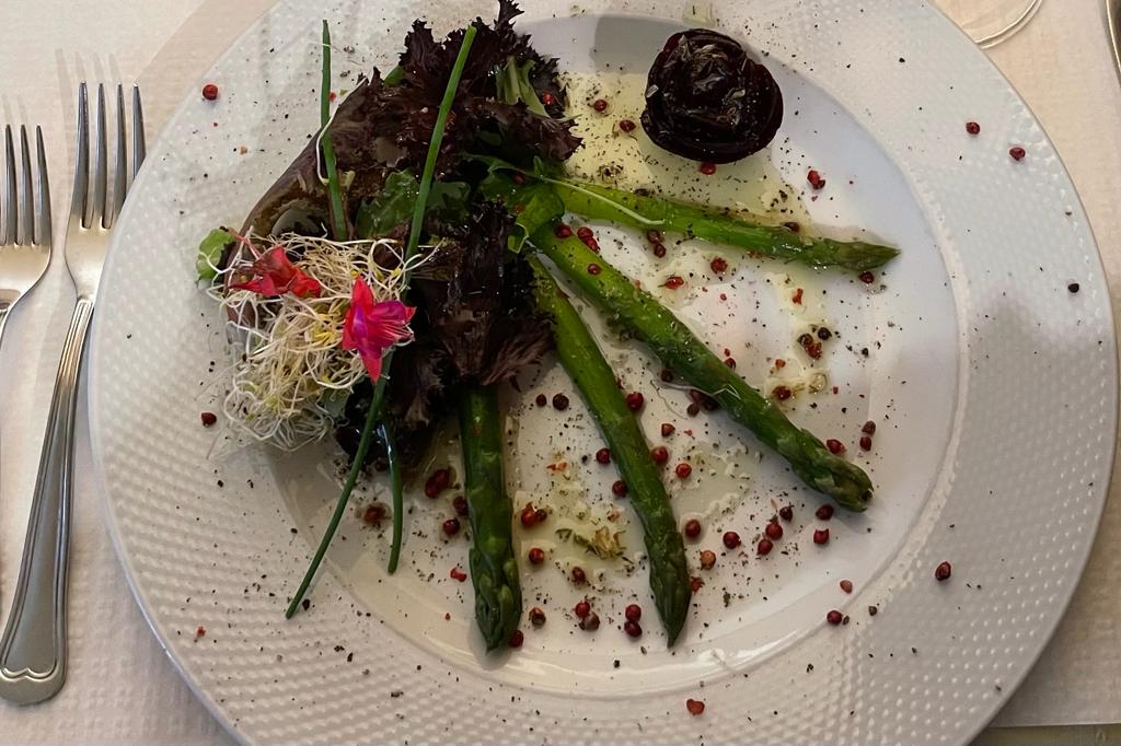 Next came the cold starter: green asparagus adorned with a delightful dressing, pink pepper, and chives. Not only did the chef present it beautifully, but it also delighted our taste buds.