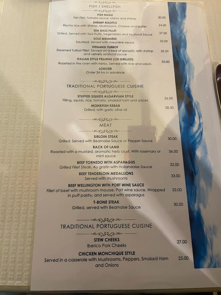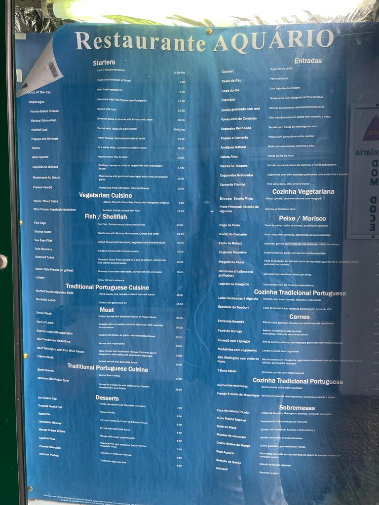 The menu at Aquário Bistro boasts a delightful selection of classic dishes, particularly of French origin, including options like coquilles st jacques (€17) and sole meuniere (€30).