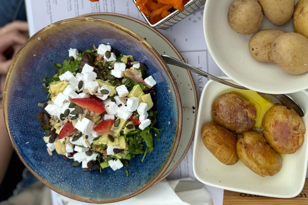 The Greek salad with vegan Greek cheese (€16) is a true flavor explosion that will even delight non-vegans. Side dishes such as boiled potatoes and garlic potatoes are pure and delicious. Don't forget to indulge in the delightful red house wine for €5.50 per glass.
