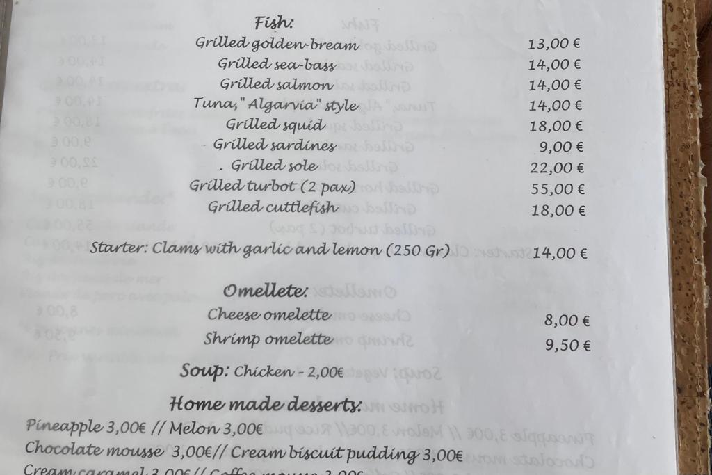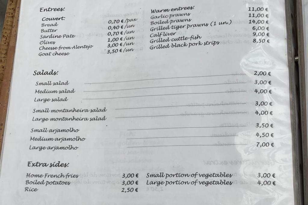 Old-fashioned low prices; salad 2 euros, main courses from 9 euros and dessert 3 euros...