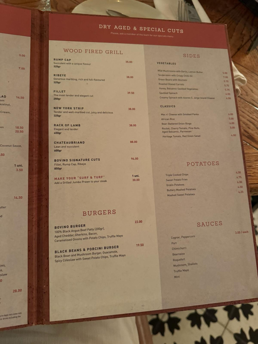 The atmosphere at Bovino Steakhouse may remind you of other steakhouse establishments like Sal & Fogo in Vilamoura and Danos in Almancil. However, it is essential to mention that while Bovino offers a remarkable dining experience, its vast size can make it feel somewhat impersonal.