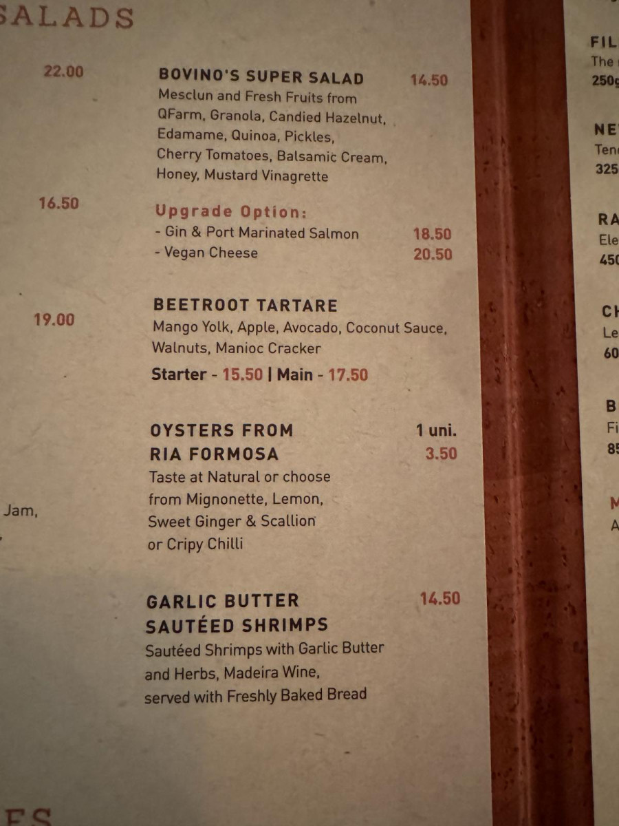 Notably, this steakhouse also caters to vegans with three delectable choices: Vegan Black Bean Burger (€19.50), Beetroot Tartare with Avocado and Walnuts (€17.50), and the delightful Bovino Super Salad with edamame and vegan cheese (€20.50). Additionally, they provide delicious gluten-free bread for those with gluten allergies.