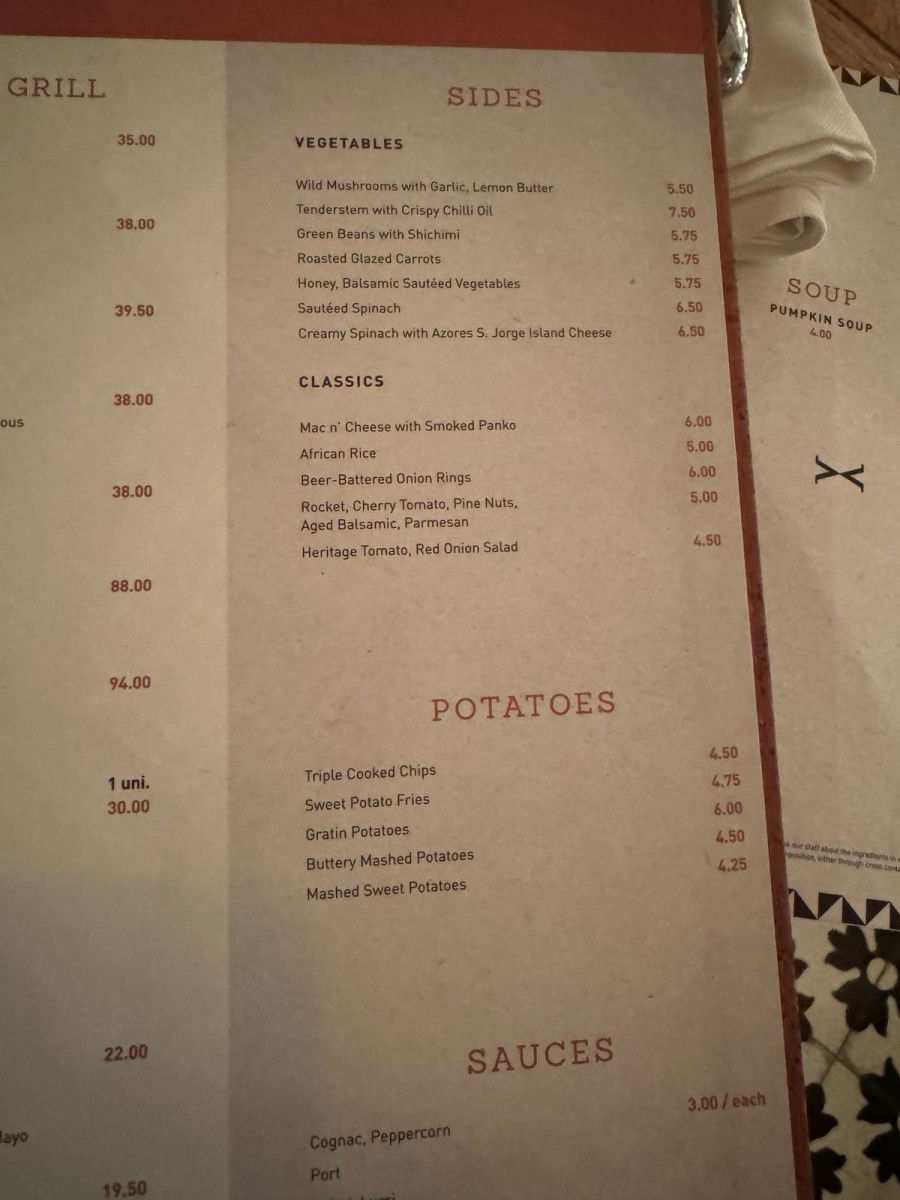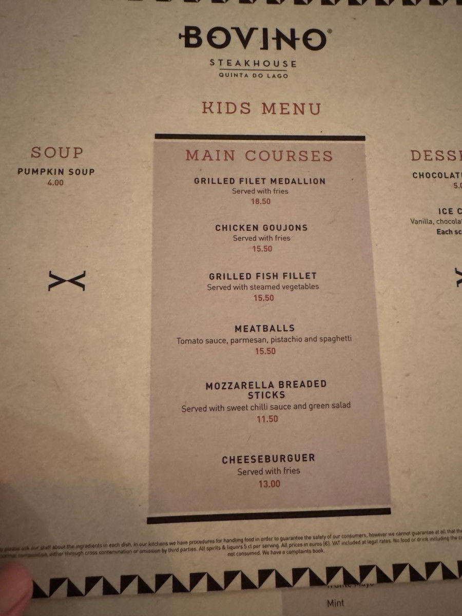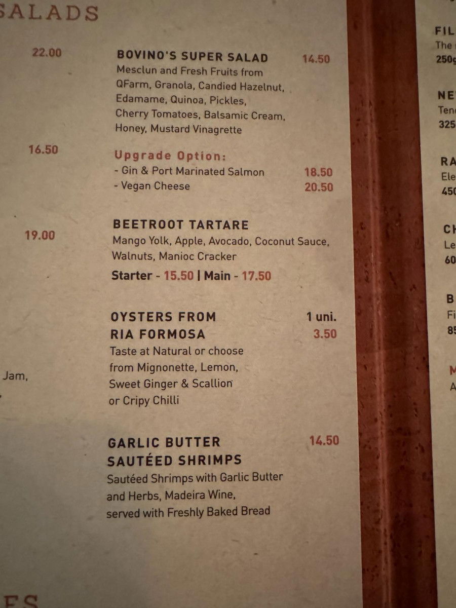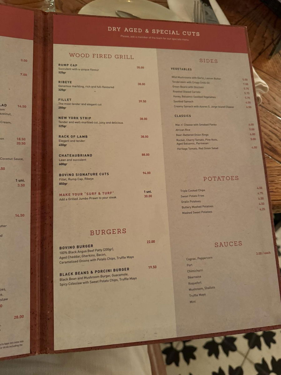 Bovino Steakhouse offers an extensive menu with prices in the higher range. Meat enthusiasts can savor options like Chateau Brand (€88), while seafood lovers can indulge in dishes such as the catch of the day (€33.50) or oven-baked shrimp (€35).