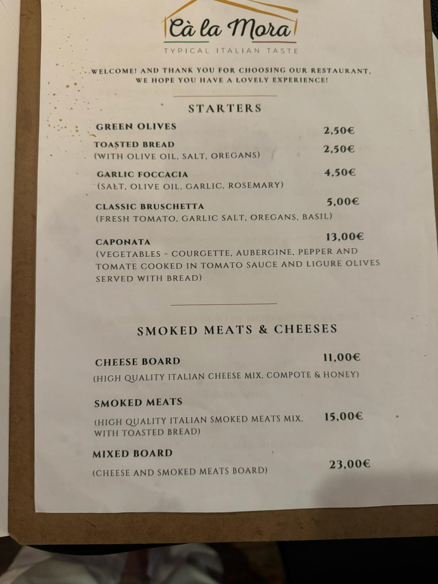 The food at Ca La Mora is simply divine. From the cheese and meat platter to the pasta, pizza, salad, and escalopes, everything is mouthwateringly delicious. Accompany your meal with a delightful wine like the Taboadella Villae 2021 for 29.50 euros.
