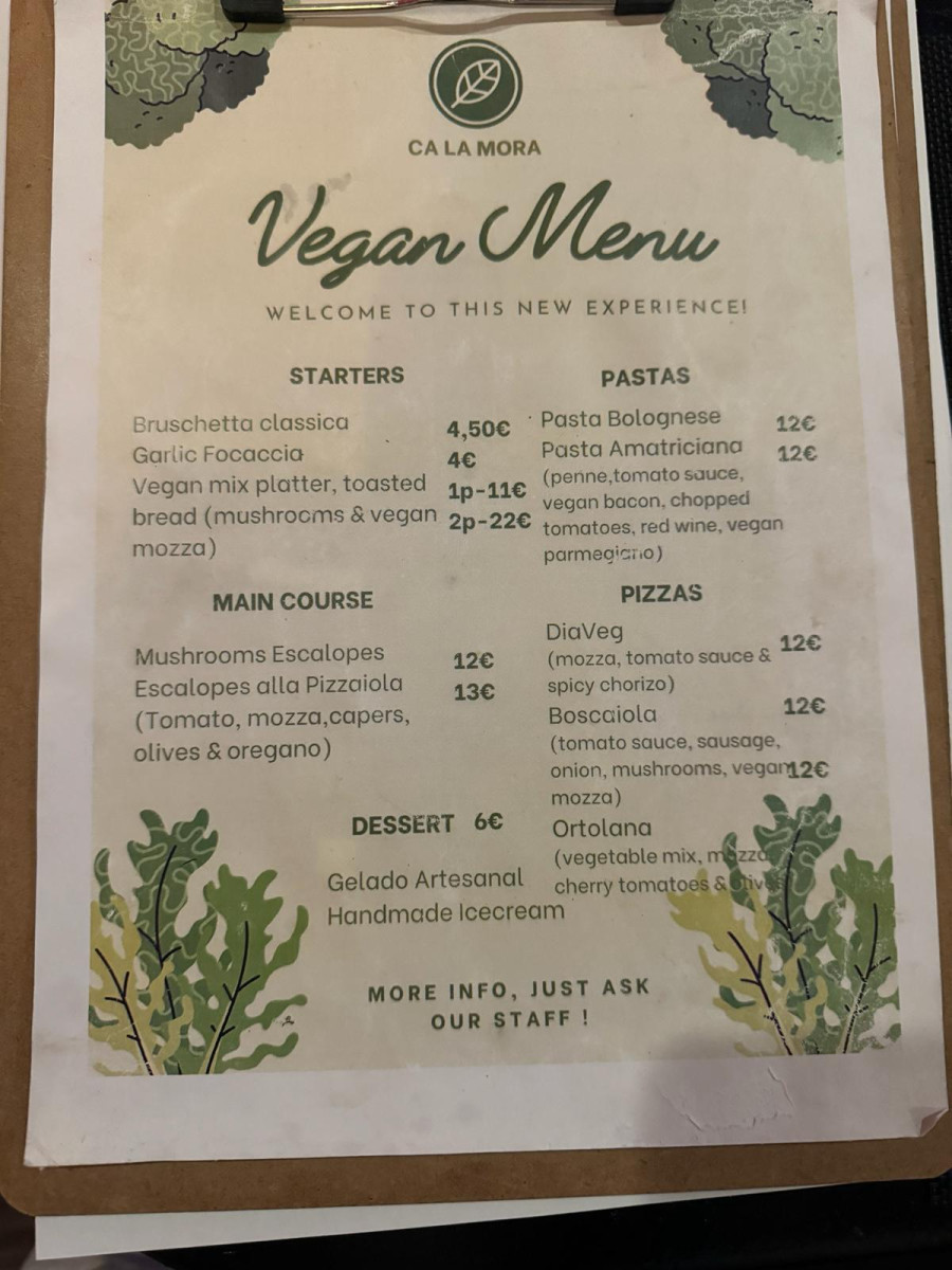 With two menus on offer, Ca La Mora caters to everyone's tastes. In addition to the regular menu, there is a special menu featuring vegan dishes.