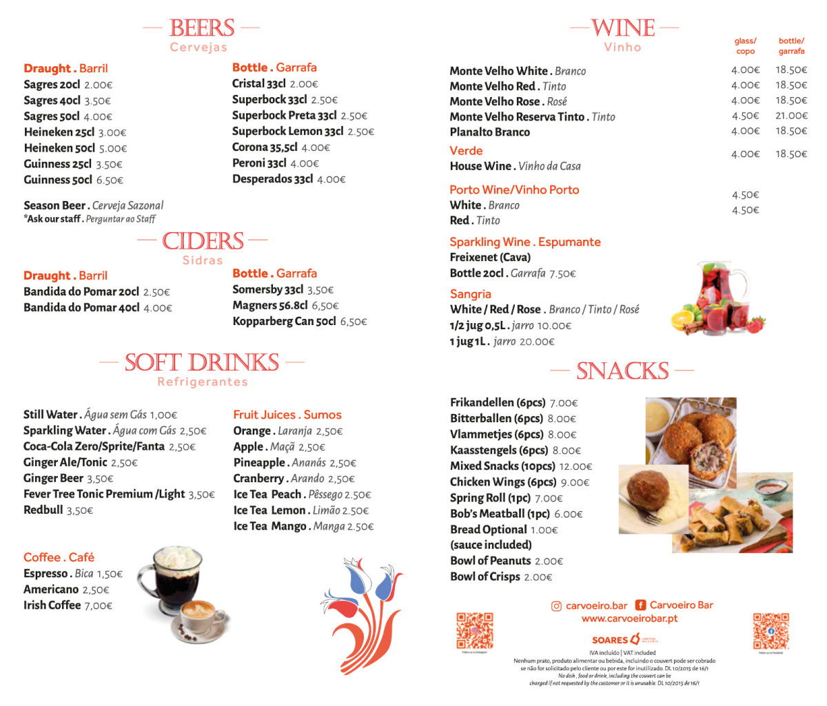 A good pub experience isn't complete without some delicious snacks, and at Carvoeiro Bar, you're in luck. The Dutch snacks are well-represented here, with classics like Dutch bitterballen (6 pieces for 8 euros) served with mustard. If you're in the mood for something else, there are also cheese sticks (6 pieces for 8 euros), spring rolls for 7 euros, and even peanuts for 2 euros. Everything you need to satisfy your hunger while enjoying a drink. 🍺