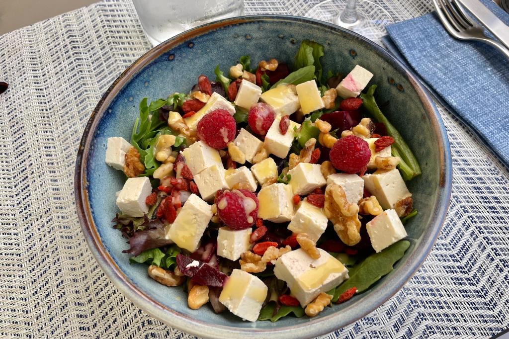 Our dining experience commenced with a delightful red wine (6.50 euros), followed by a beetroot salad (12 euros) as an appetizer. For the main course, we savored a vegan wrap (14 euros) bursting with fresh flavors, concluding the feast with a crisp, chilled white Douro wine (7 euros).