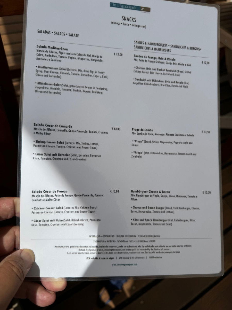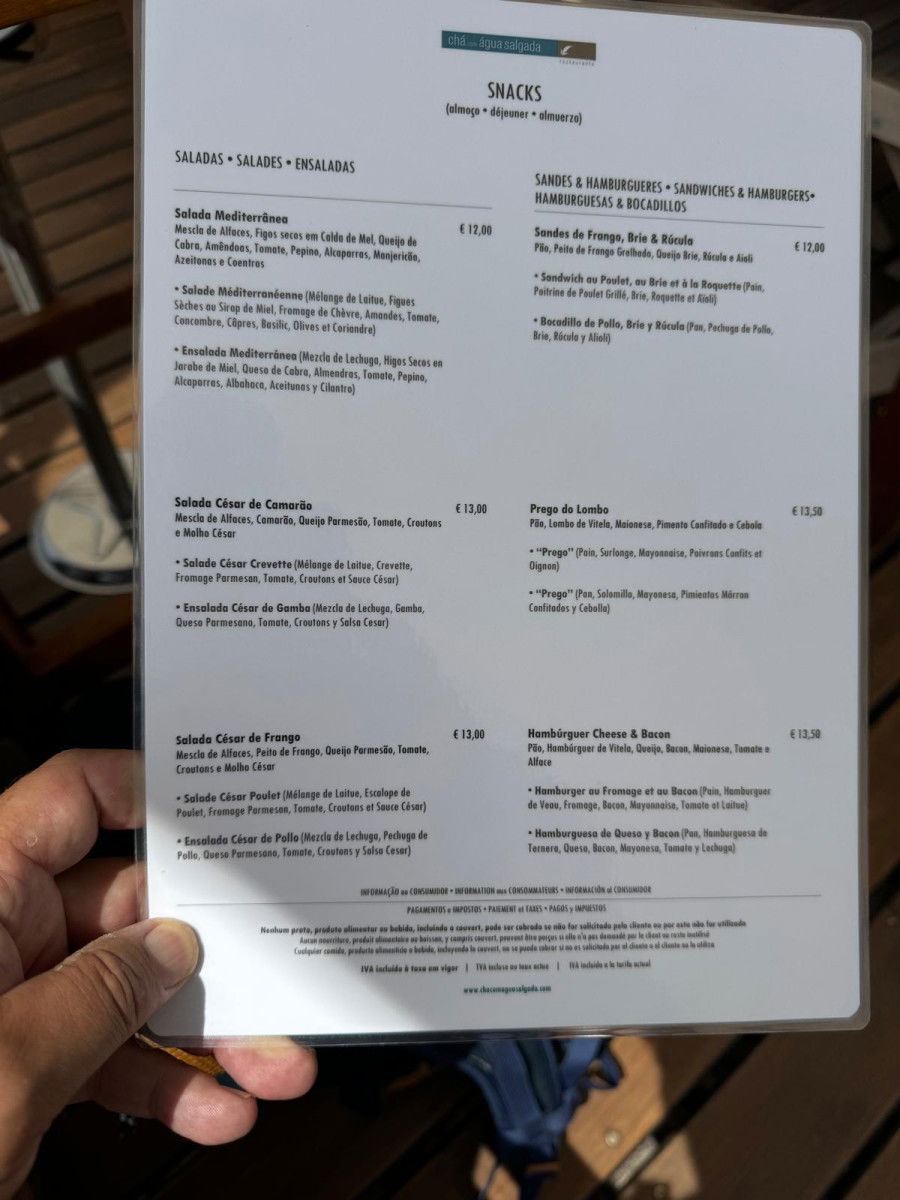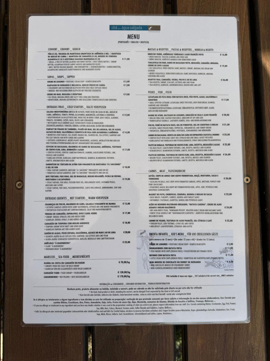 Chá Com Água Salgada is a beautiful Portuguese beach restaurant right by the sea. With a good variety of dishes, delicious house wines, superb service, and a great ambiance, this restaurant is a must-visit. Despite it being a 45-minute drive, I will definitely come here more often. Try it yourself and enjoy the unique experience!