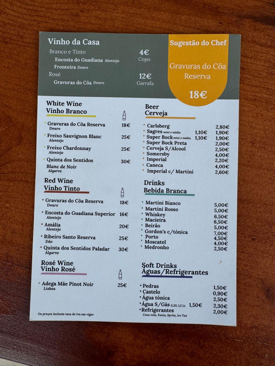 During our Sunday lunch, we enjoyed a flavorful vegetable soup (only 3.50 euros for a generous bowl), followed by a delicious mushroom risotto (only 10 euros) and a refreshing fruit salad (also 3.50 euros). We accompanied our meal with a delightful Portuguese Chardonnay, the Freixa Chardonnay Alentejo (25 euros), and ended with a cup of coffee for only 0.90 euros.