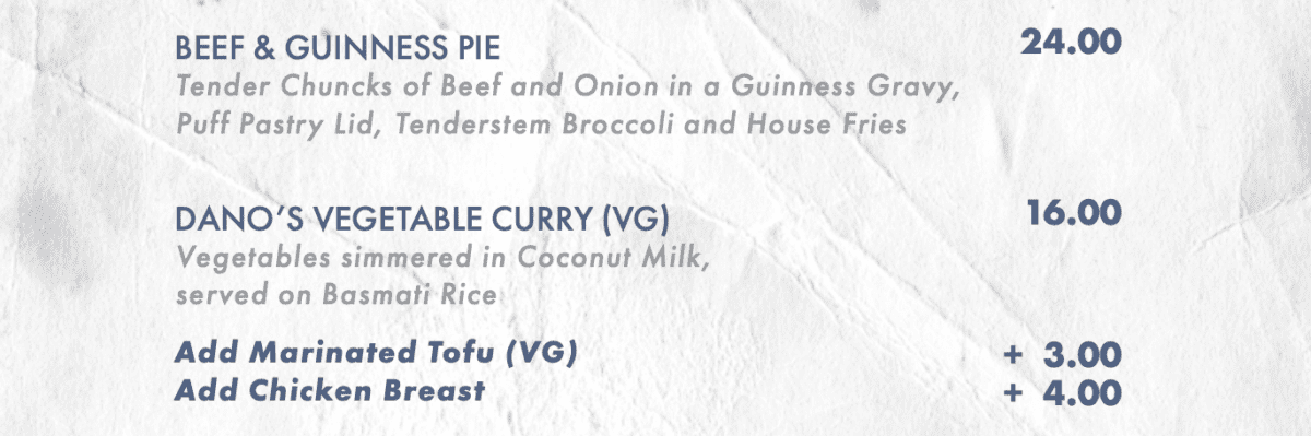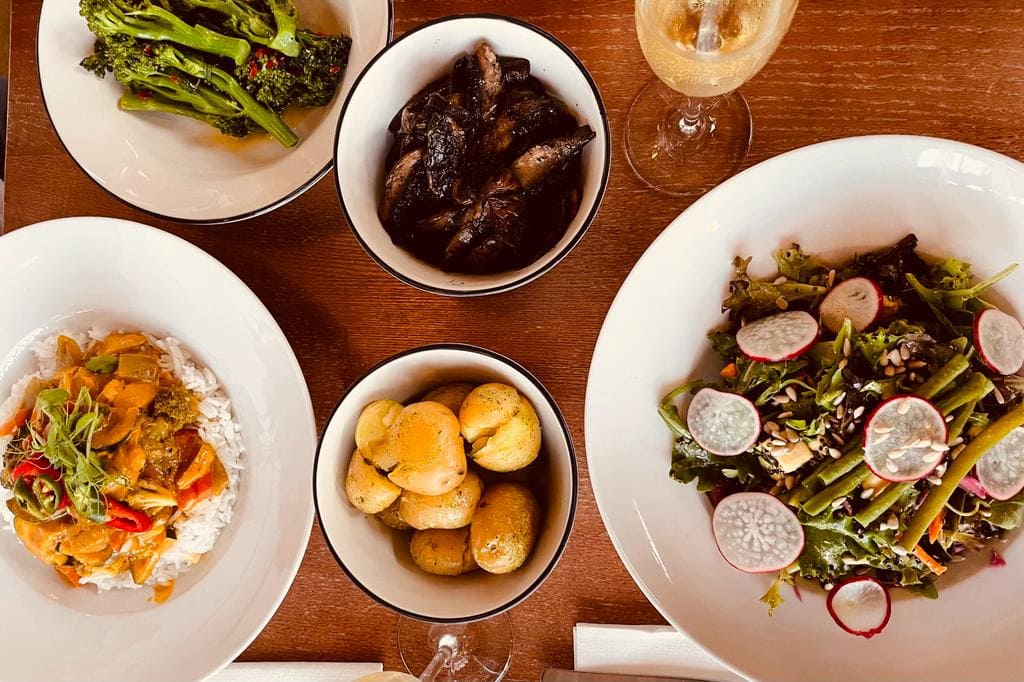 Extensive menu with no less than 9 vegan and vegetarian options. The food is good, the curry (16,-) is superb, the salad quite tasteless. And proteines, for example, nuts or fried tofu are missing here.