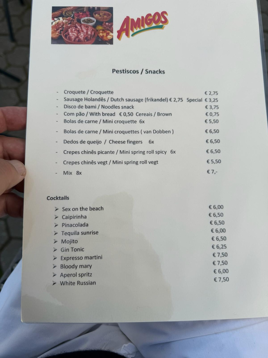 What adds to the appeal of Cafe Bar Amigos is its pocket-friendly prices. Indulge in a "Sex on the Beach" cocktail for €5.25 or a refreshing Gin Tonic for €5.75. Craving some Dutch snacks? Try their Kroket for €2.75 or Groente Springrolls for €5.50. Meatballs in satay sauce are a treat at €9.75, and a tapas board for two comes at just €16.