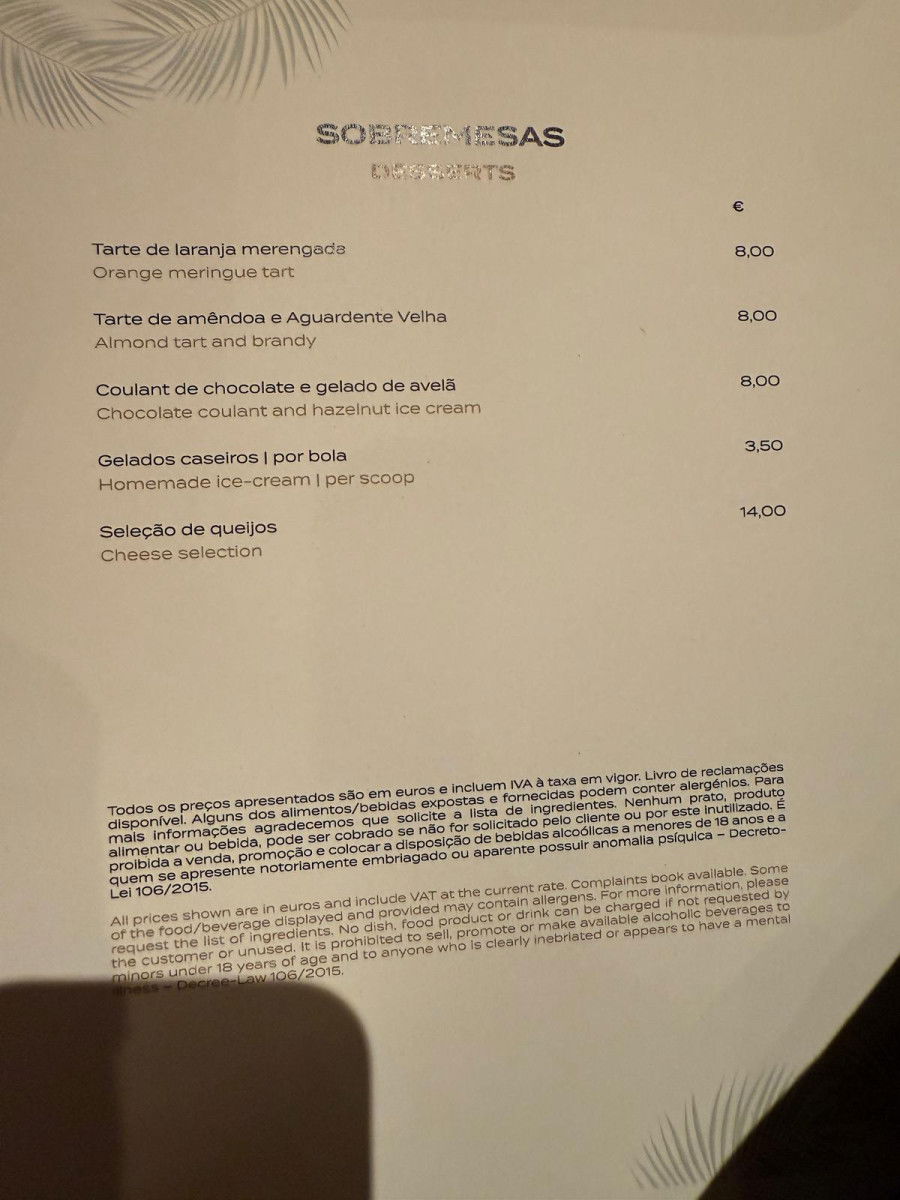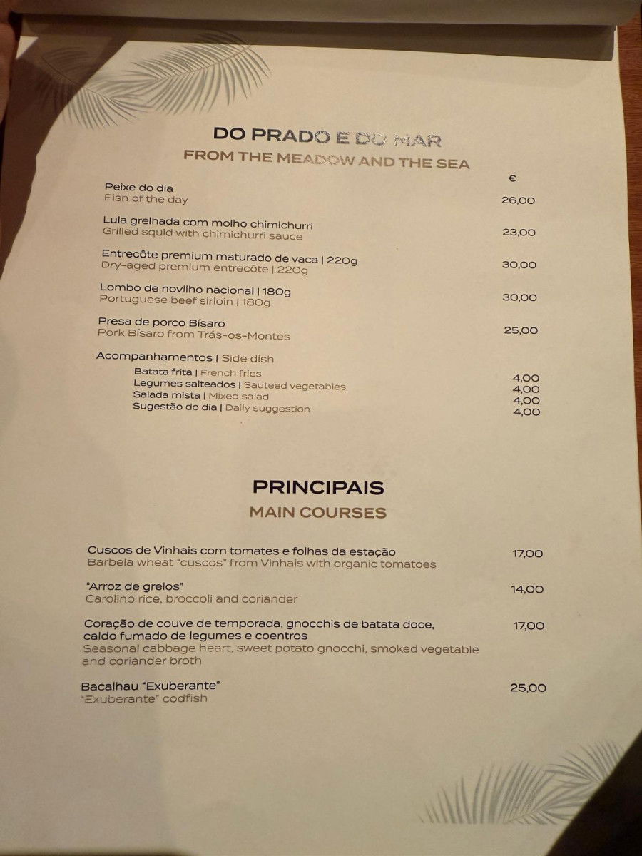 As for the mains, the ‘arroz de grelos’ (€14) and the heart of cabbage with sweet potato gnocchi and smoked broth (€17) reach true Michelin-star level — refined, creative, and beautifully plated.