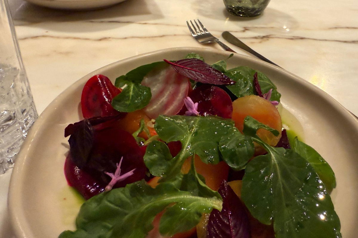 Among the starters (€14), the Stracciatella with organic beetroot, herbs, and port wine vinegar and the grilled courgettes with mint and geraniums stand out: light, balanced, and full of character.