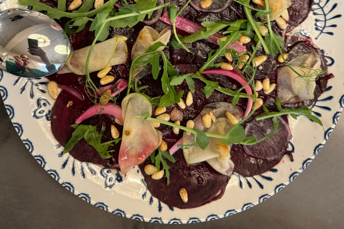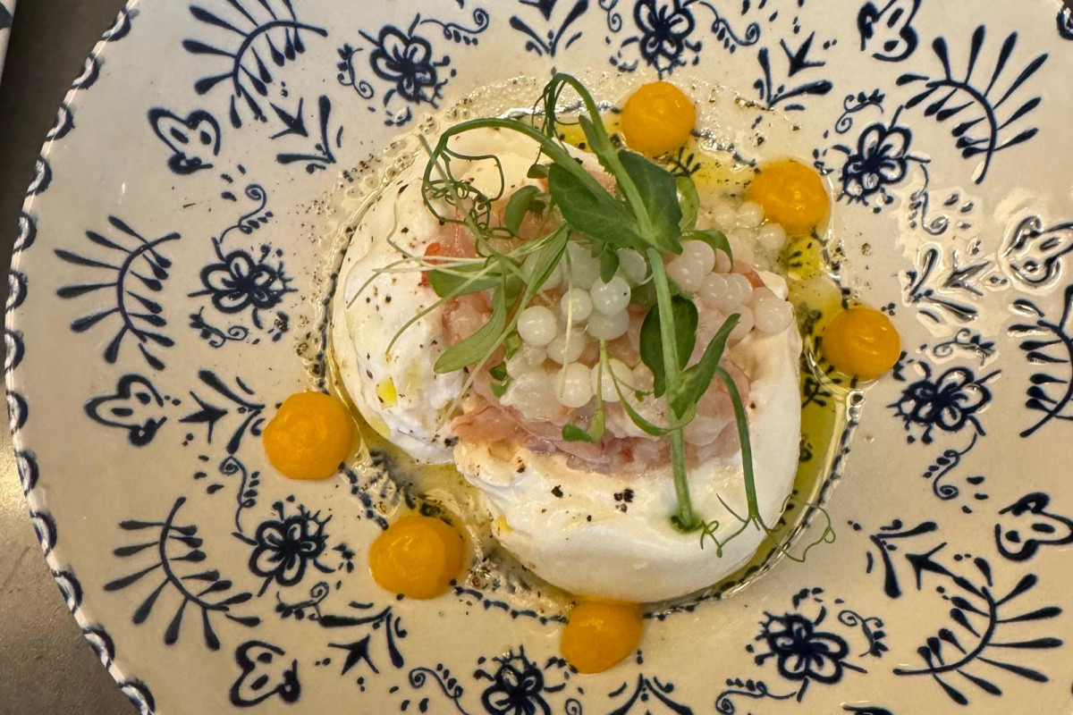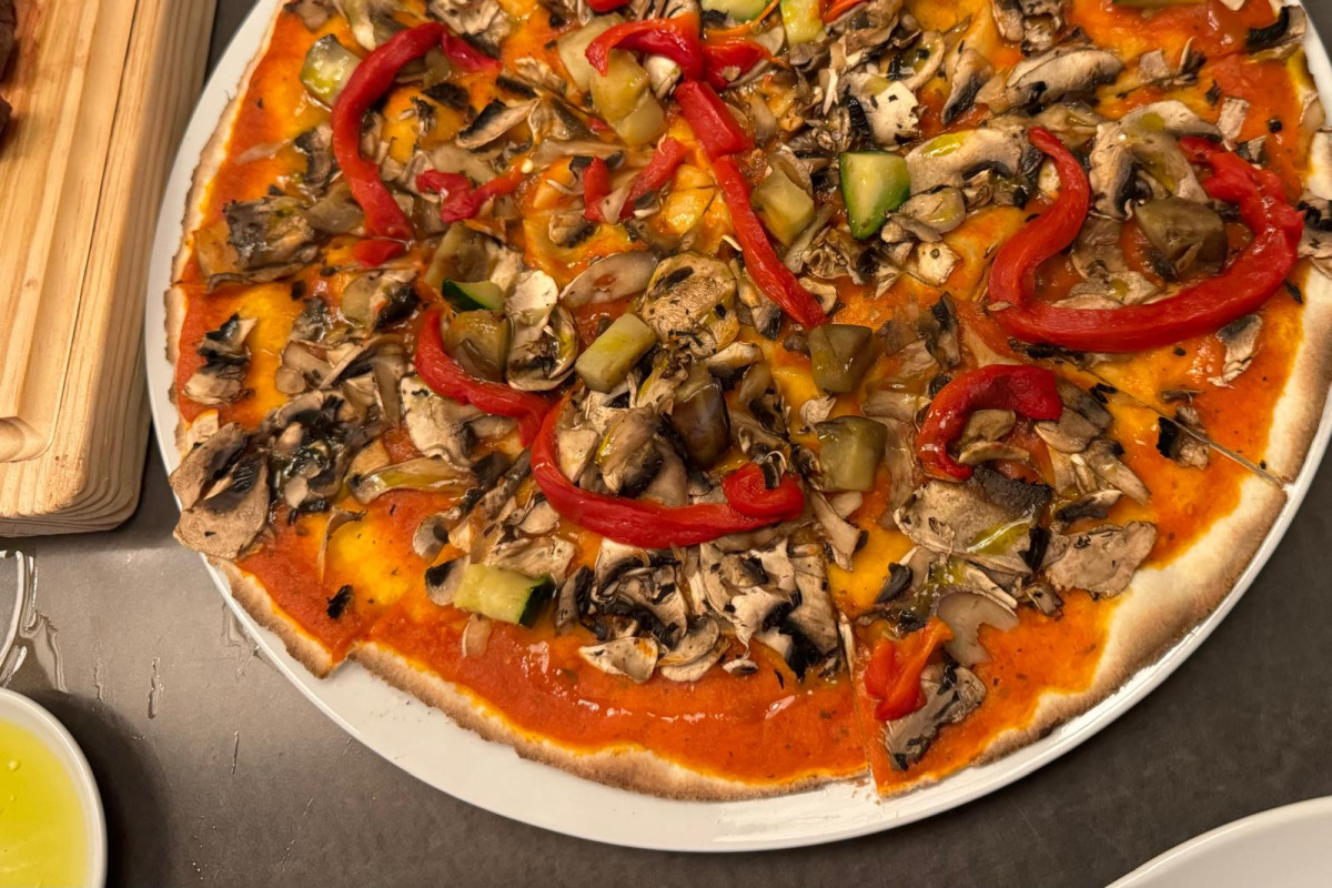 The restaurant has three menus: tapas, pizza, and a "regular" menu featuring fish and meat dishes. There are also vegetarian and vegan options available, such as Vegetarian Pizza (€15), Vegan Meal Salad (€13.50), Risotto (€22), and Tagliatelle with mushrooms and truffle (€19).