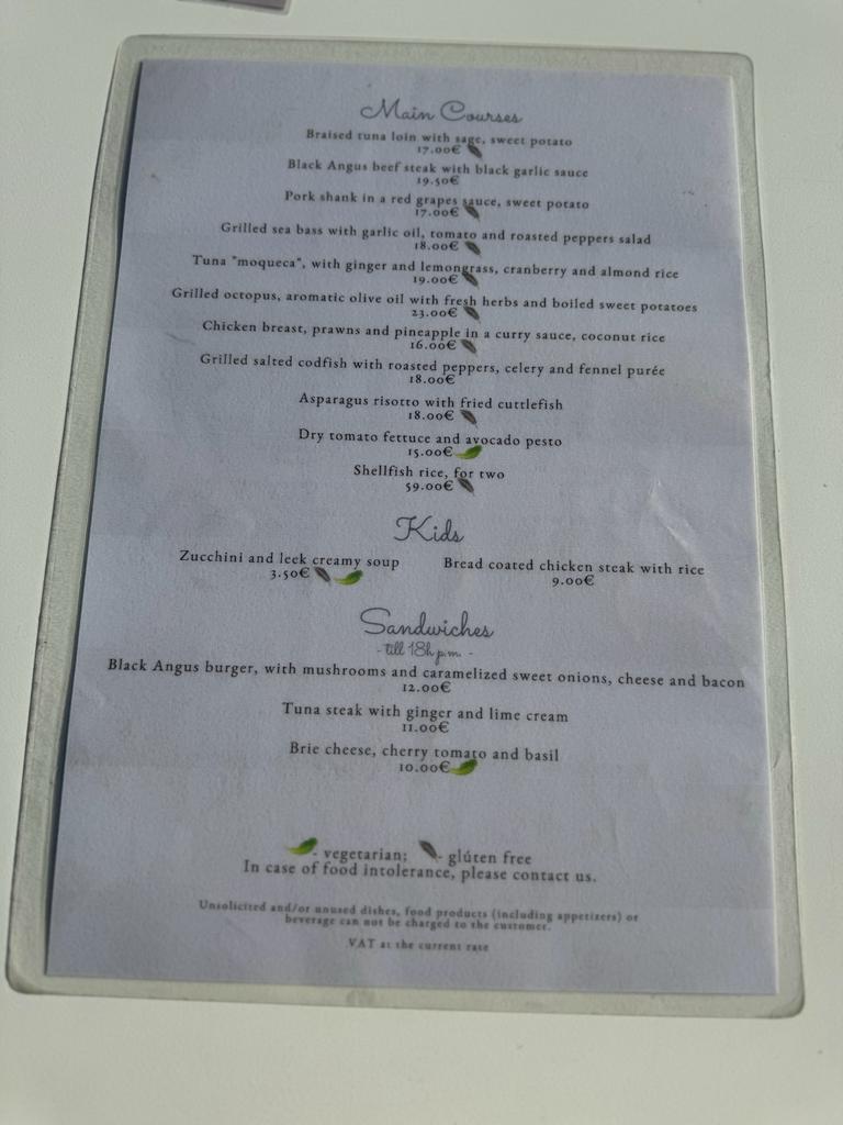 For those exploring the à la carte menu, there are delightful dishes like Pasta Pesto (15 euros), Risotto (18 euros), Octopus (23 euros), and even a tasty cataplana for two people (52 euros).