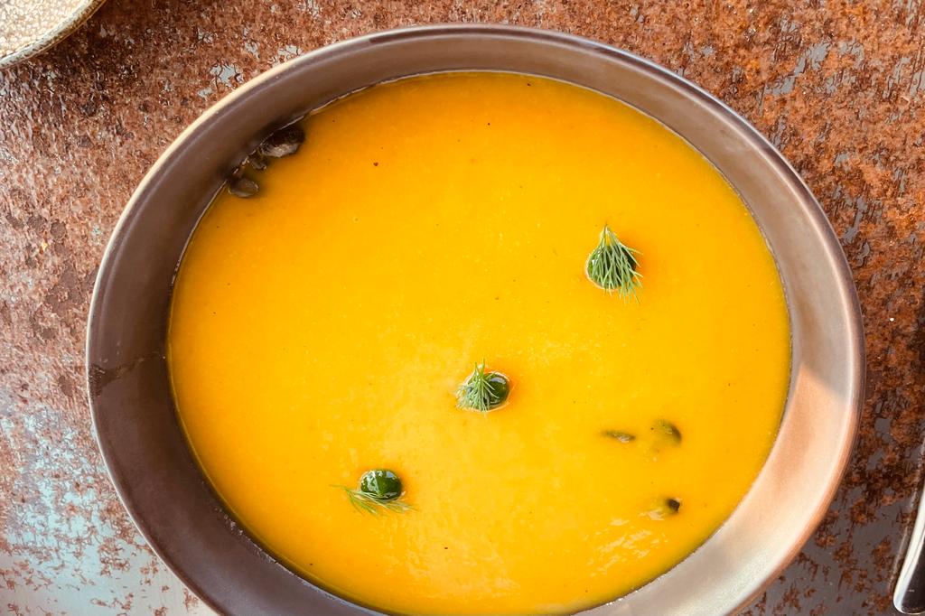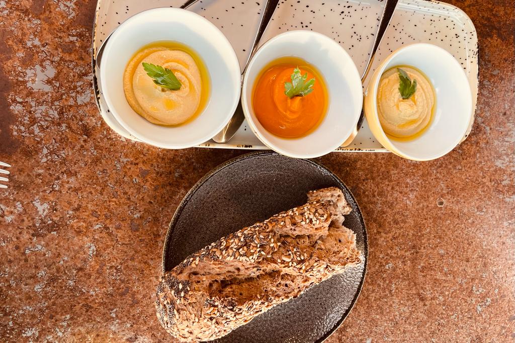 We start a lovely glass of white and with a delicious couvert, with carrot and lupine humus and delicious fresh bread. And the olive oil is the best I've ever had!