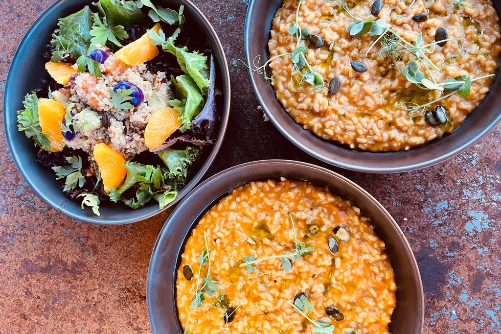 Risotto rice with pumpkin and a fresh quinoa salad with orange .