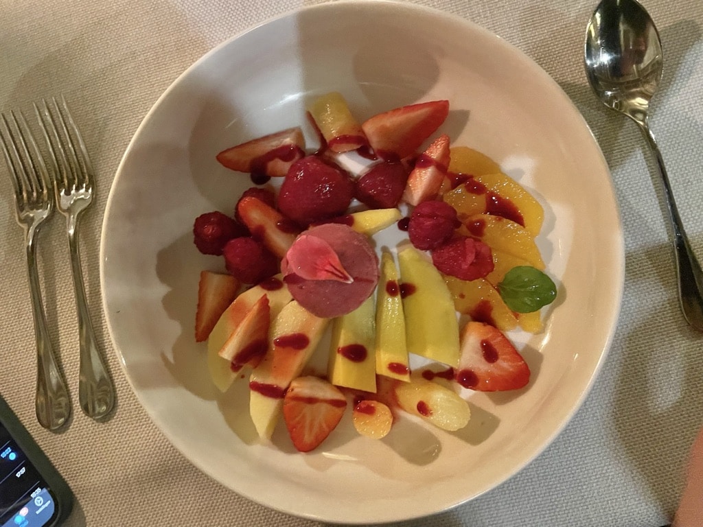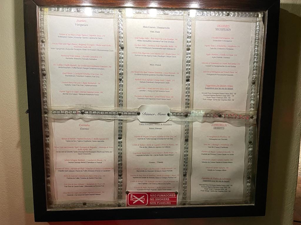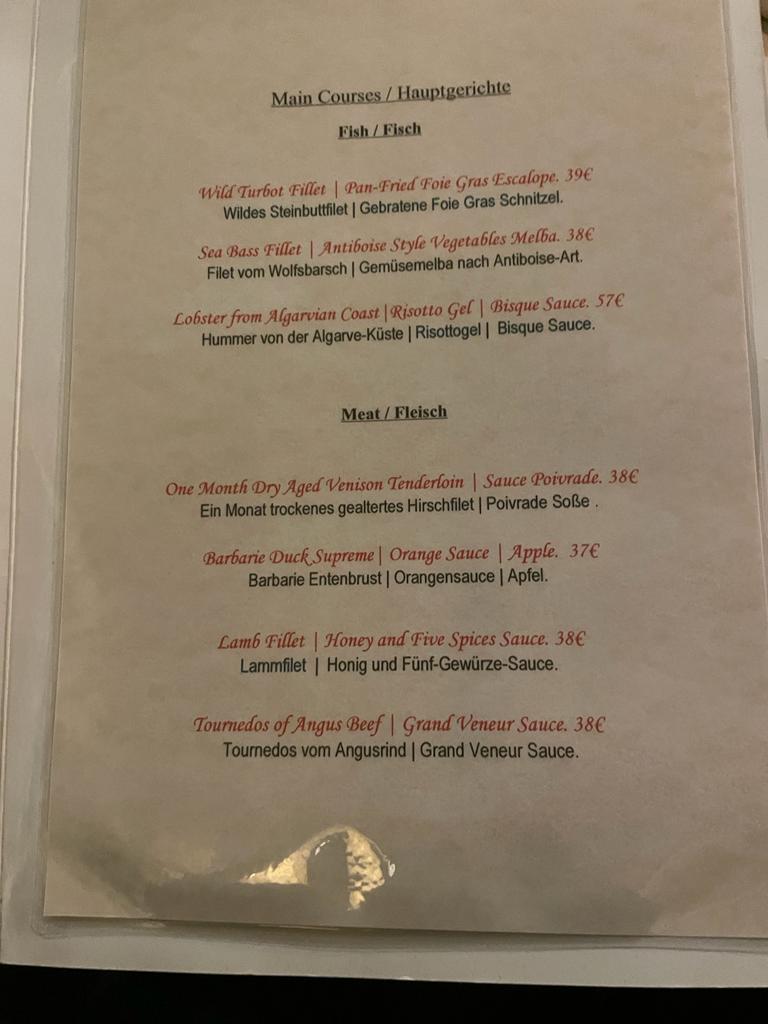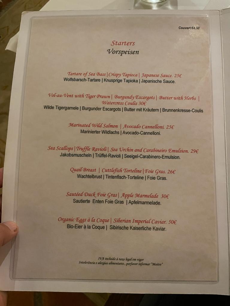 In addition to the lunch menu, there is an extensive dinner menu. The starters are quite expensive, starting at 25 euros. For the main courses you can choose fish (38 -57 euros), meat (38 euros) and vegan (20 euros). Dessert costs around 15 euros.