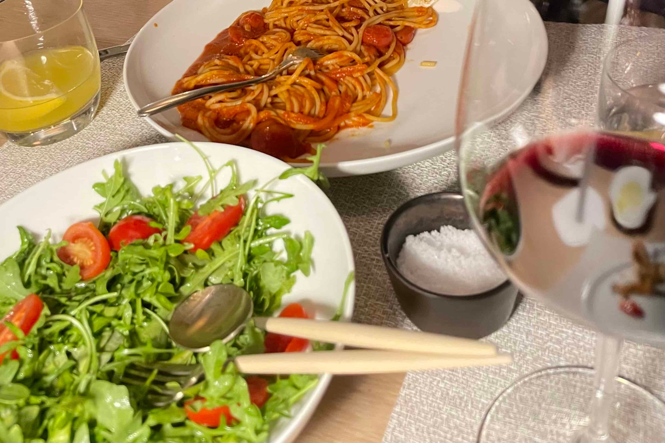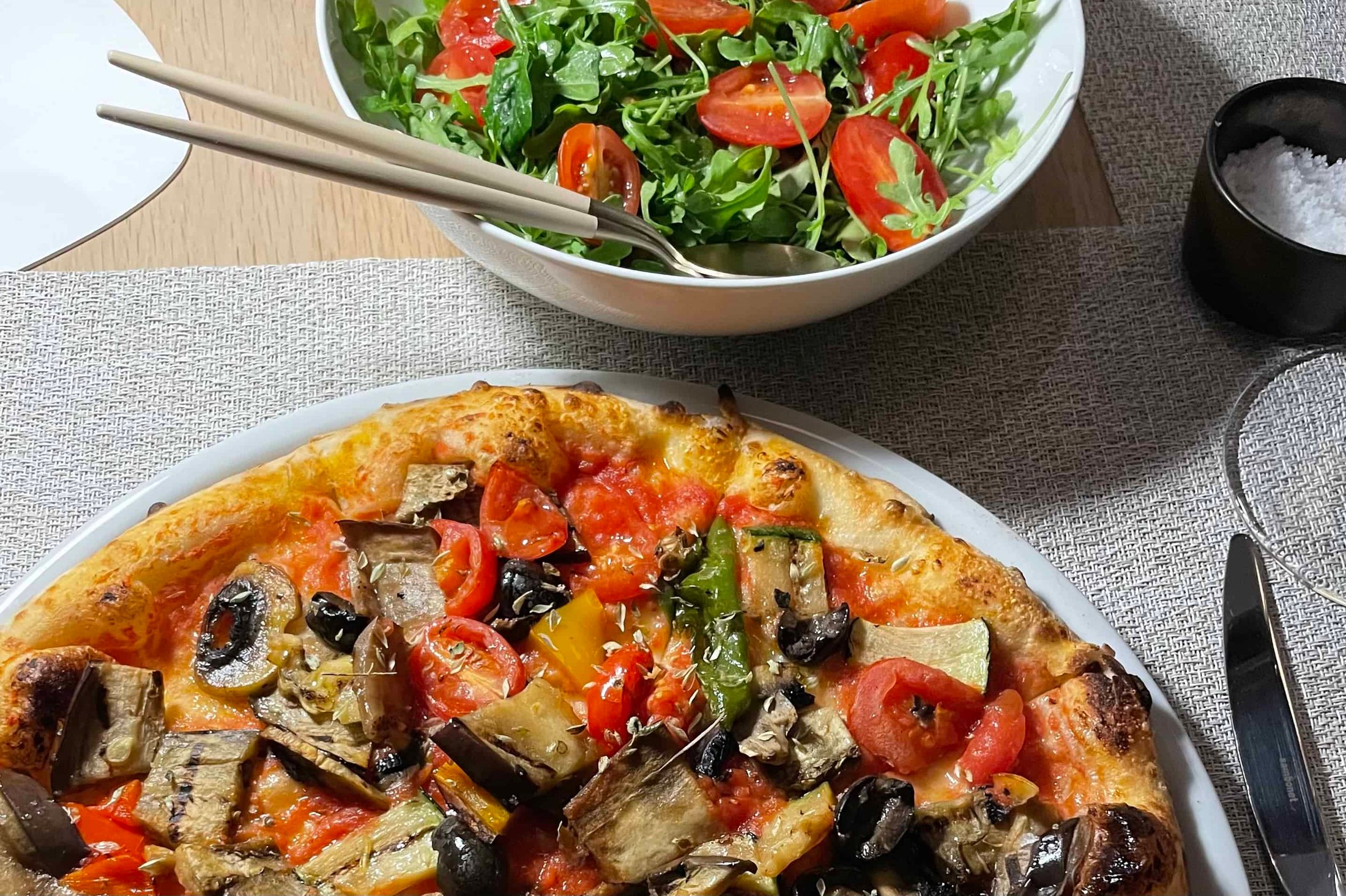 Then we choose the pasta napolitane (gluten-free) and the veggie pizza. Both are very tasty, just as it should be. Enjoy! And finally a fresh rasberry gelati and an espresso.