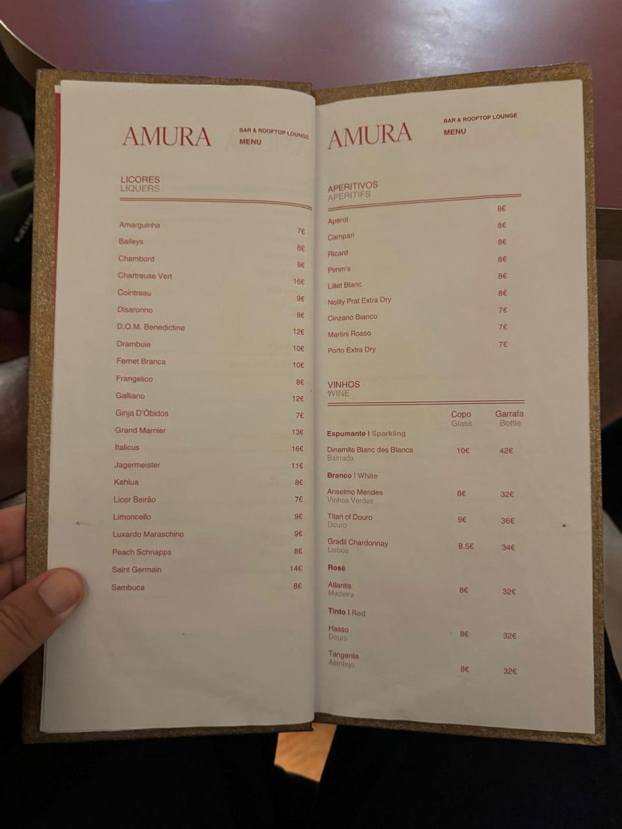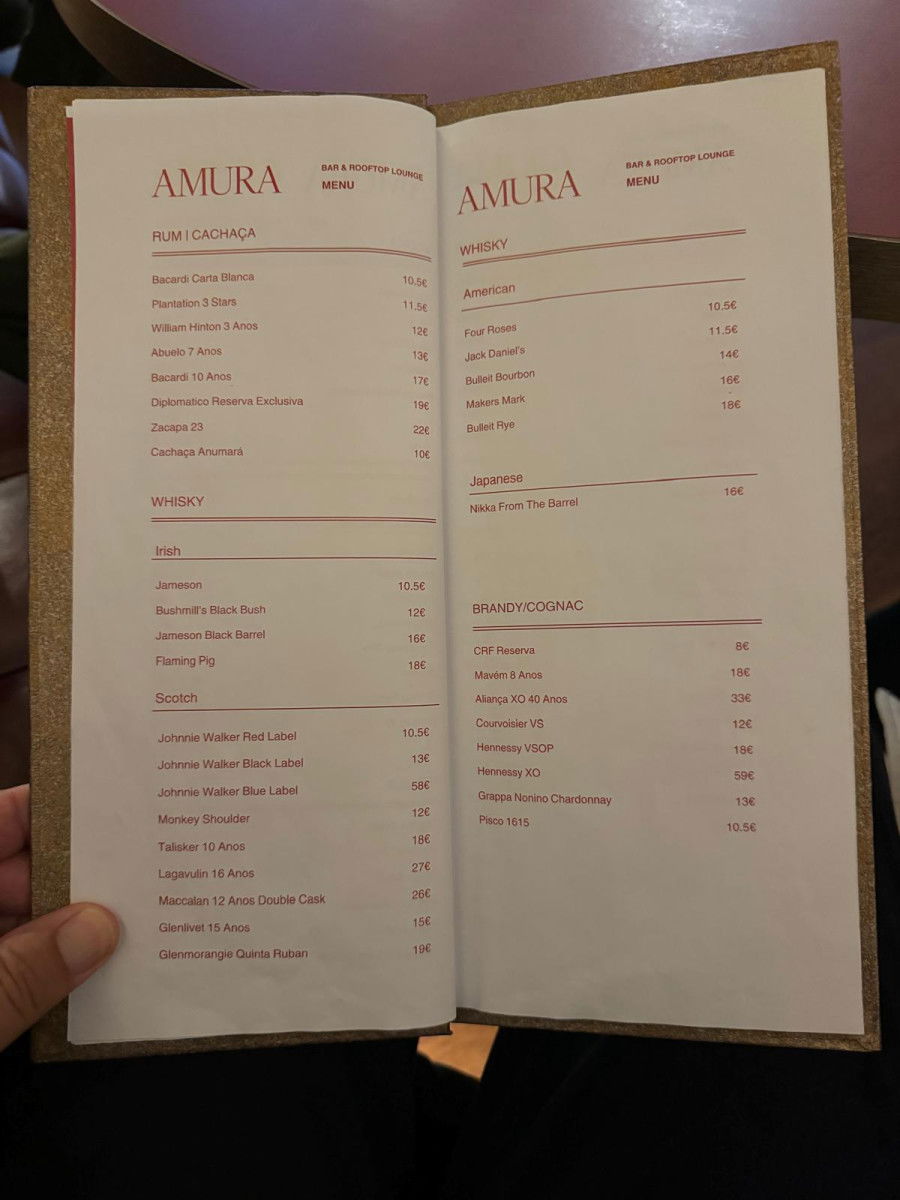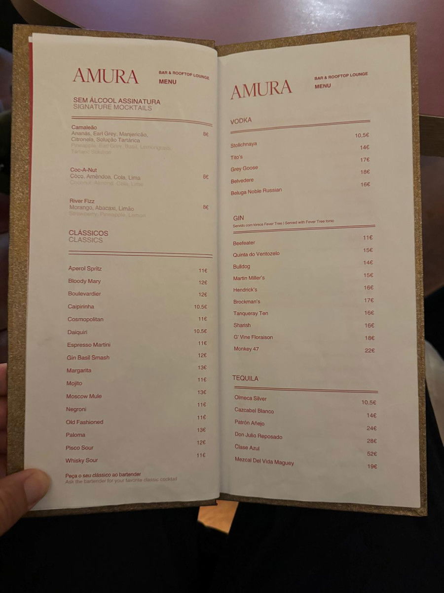 Amura Cocktail Bar, located inside Hotel das Virtudes, offers a luxurious and unique experience for anyone looking to escape the city’s hustle and bustle. It’s the perfect spot to unwind with a delicious cocktail like an Aperol Spritz, Bloody Mary, Espresso Martini, or a refreshing Moscow Mule, priced between €10-13. With calm music and a relaxed vibe, Amura is the ideal place to recharge after exploring the city.