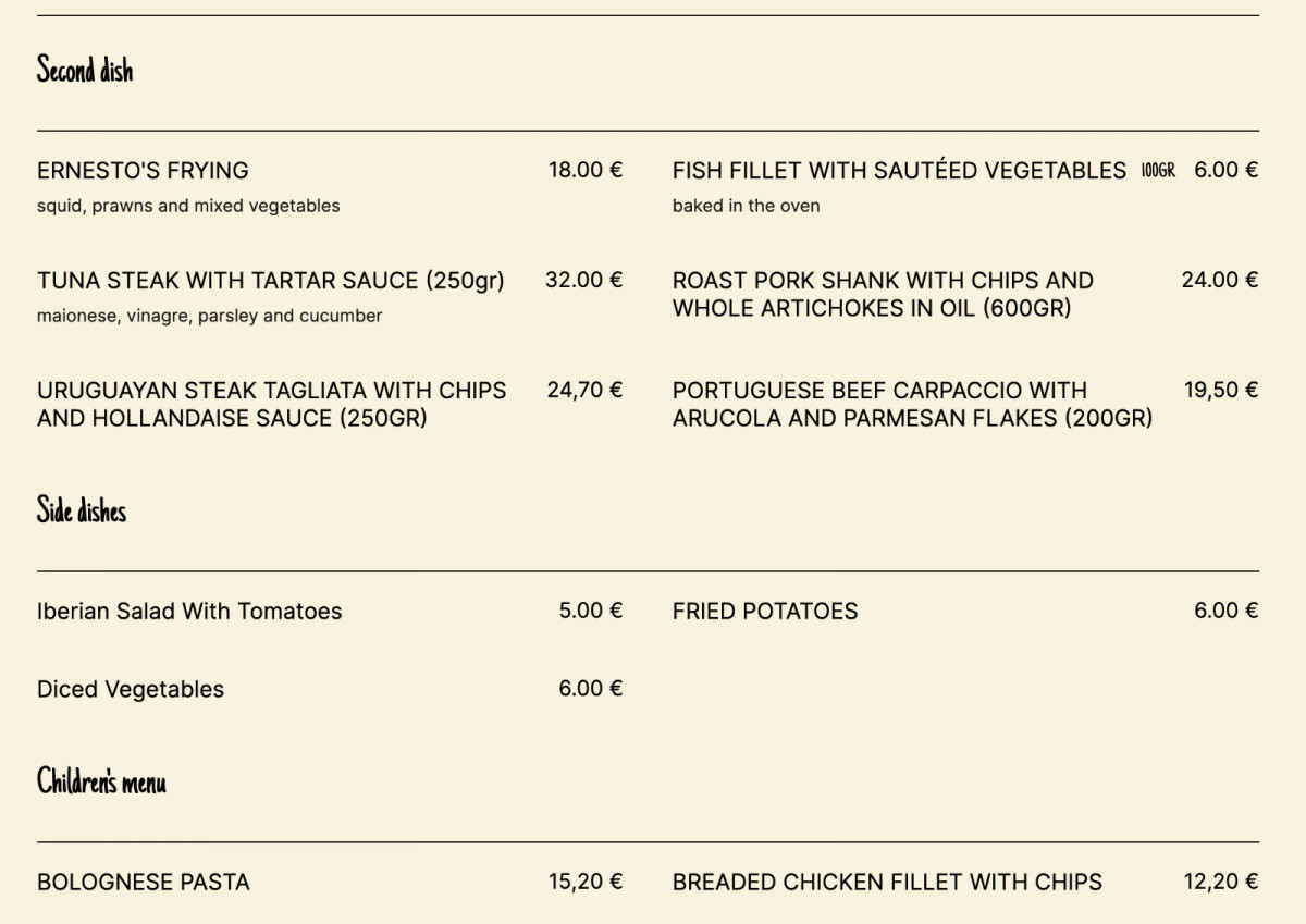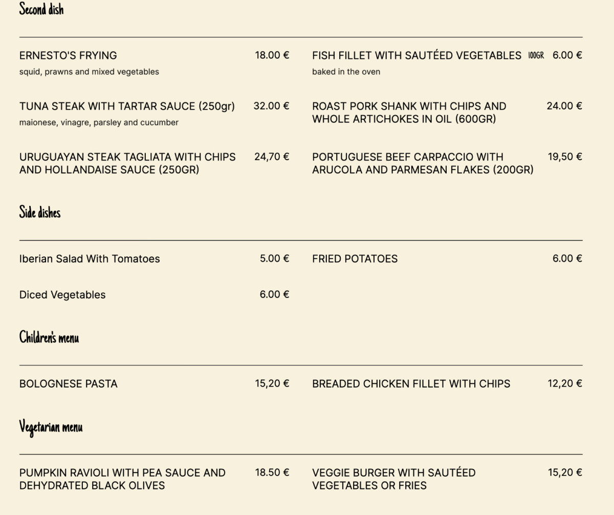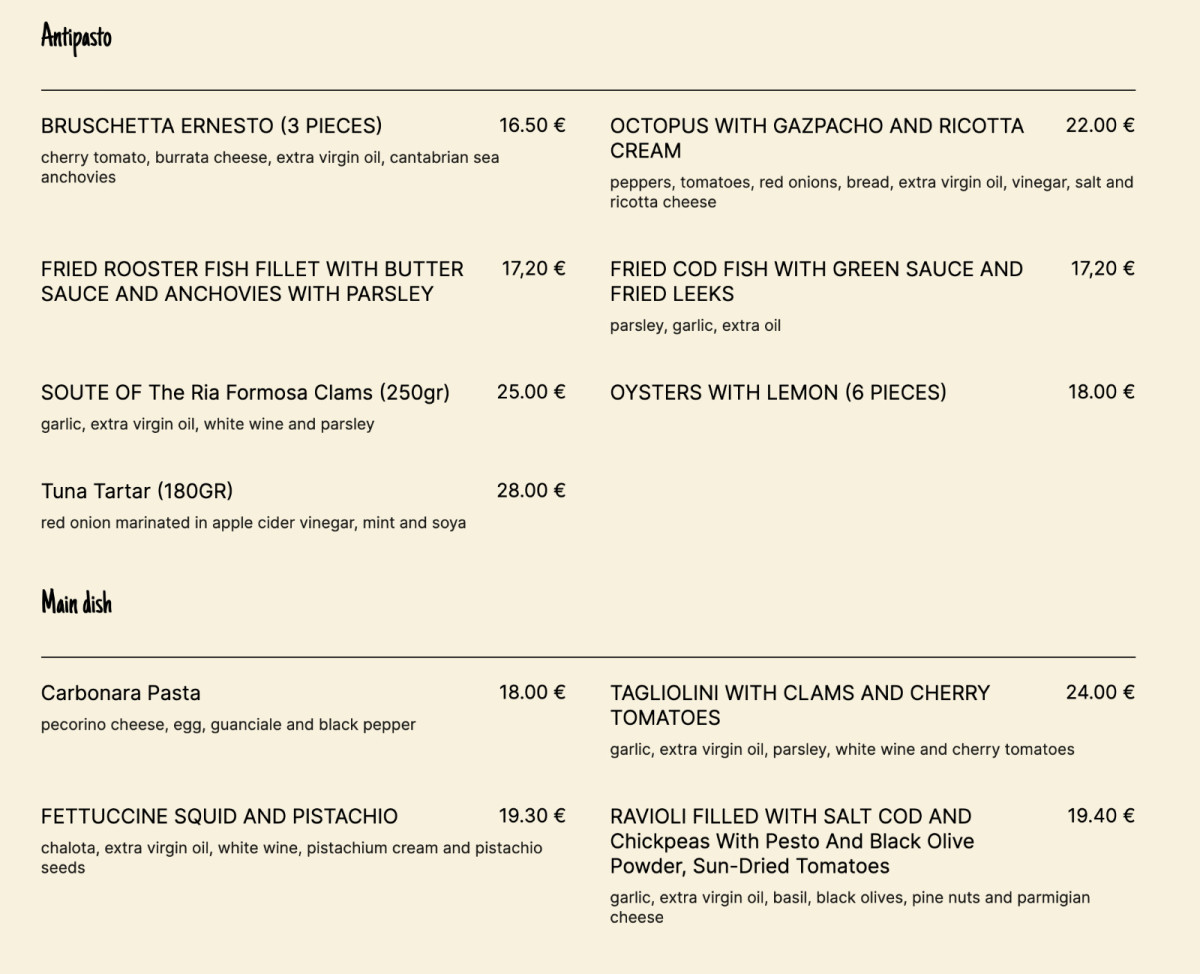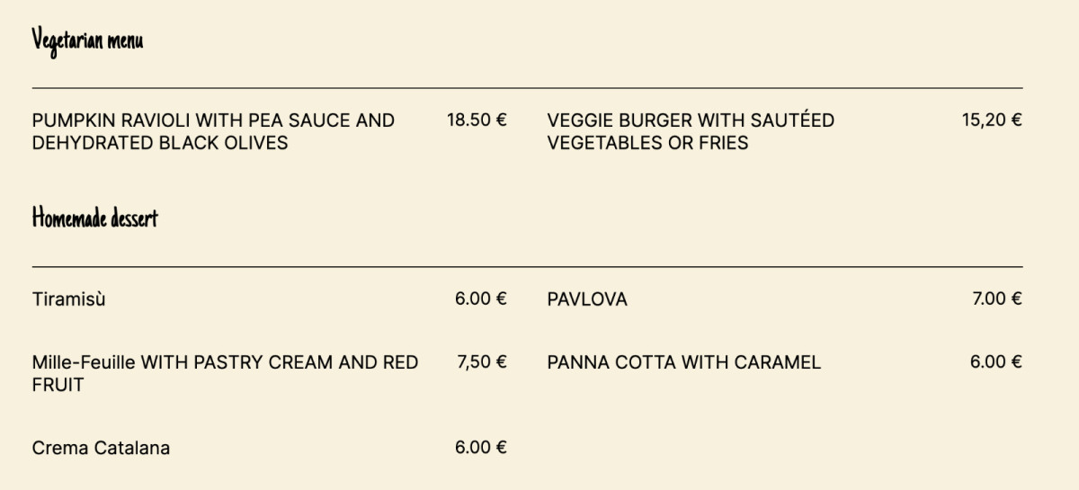 From Antipasti to Primi and Secondi, each dish is a tribute to Italian gastronomy. Be sure also to try the vegetarian dishes like the Pumpkin Ravioli with pea sauce (€18.50) or the fantastic Pasta Pesto (€15).