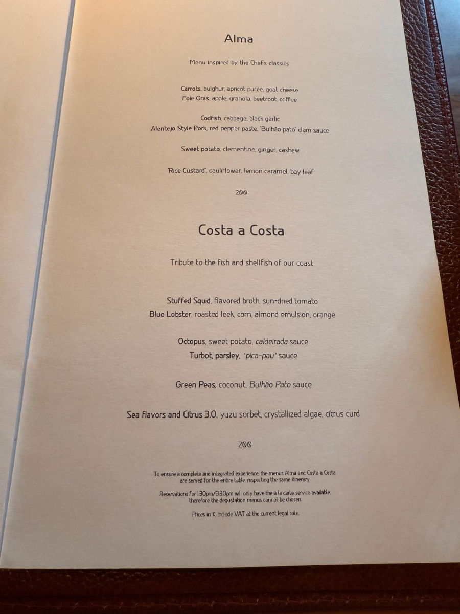 Everything was perfect: the food, the service, the chef’s presence, the acoustics, the wines, the atmosphere. Alma is easily among Lisbon’s best restaurants — refined yet relaxed.