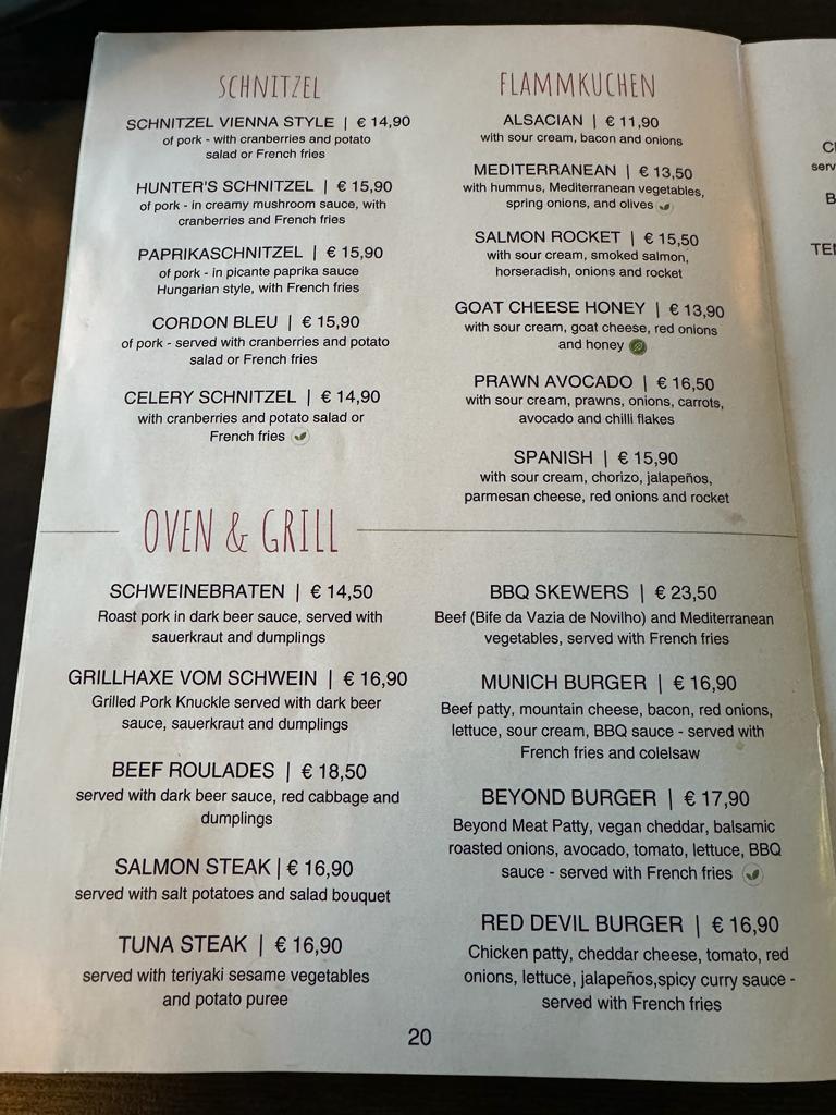 For dinner, options include paprika schnitzel (€15.90), vegan schnitzel (€14.90), beyond burger (€17.90), and salmon (€16.90).