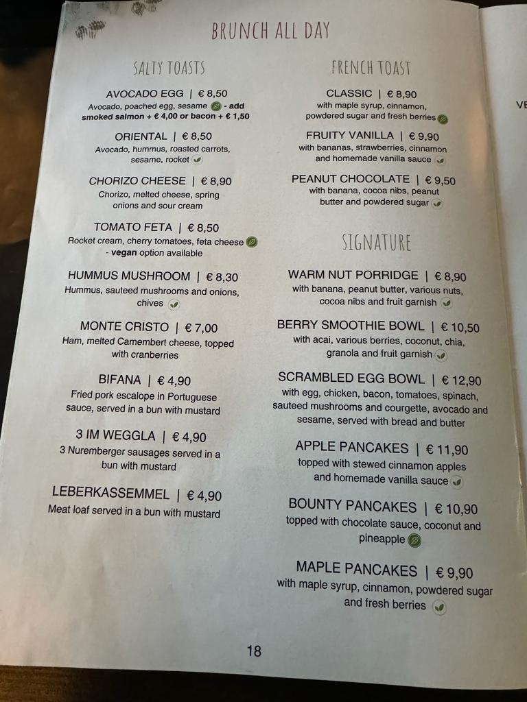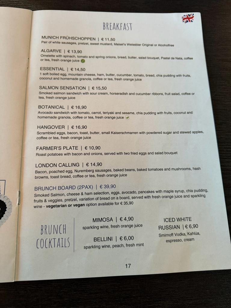 What makes Munich unique is that they are open all day. The menu is diverse and original. For breakfast enthusiasts, there are options like avocado and egg toast (€8.50) or the eye-catching Hangover breakfast (€16.90).