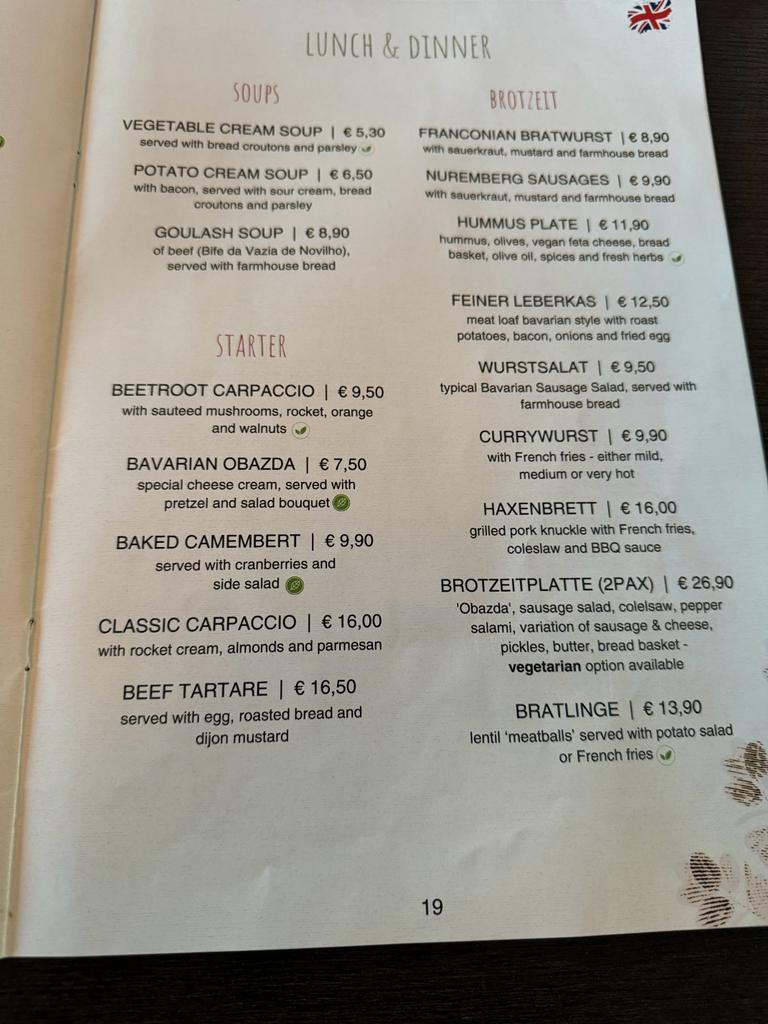 Lunch and dinner at Munich are equally tempting. Try the bratwurst with bread (€8.90), flamkuche (€11.90), tasty meal salads (€13.90), or the delightful vegan Hummus Plate (€11.90).