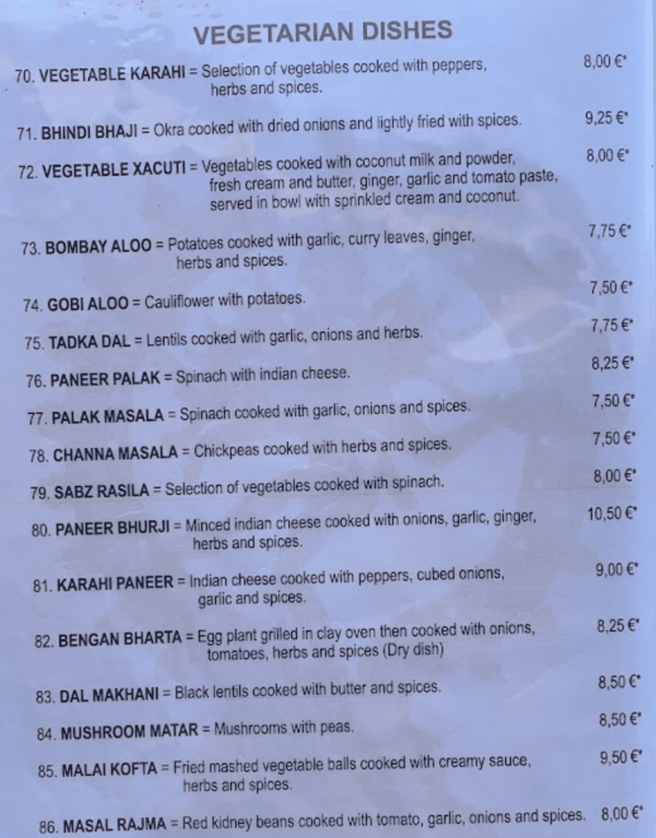 There are lots of options for vegetarians and vegans, like: Mushroom Bhajee (9.75), Vegetable Biryan (10.50), Bengan Bharta (9.50) and Saag Aloo (8.95)