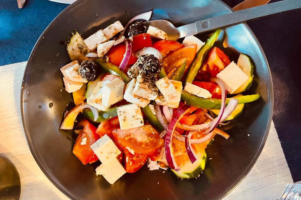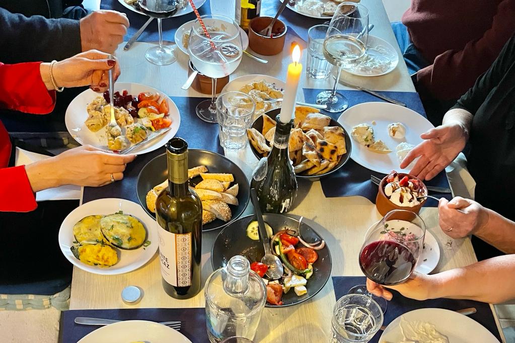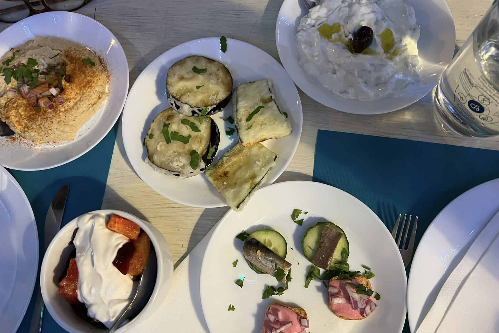 After the wine has been poured, a bread basket is placed on the table containing deliciously crispy bread. And then came the other snacks / dishes from the Greek kitchen. How delicious they were. One was not yet finished when the next dish was brought. The menu consisted of:
