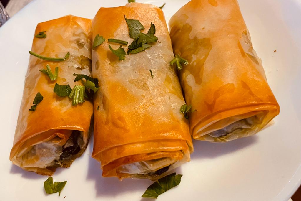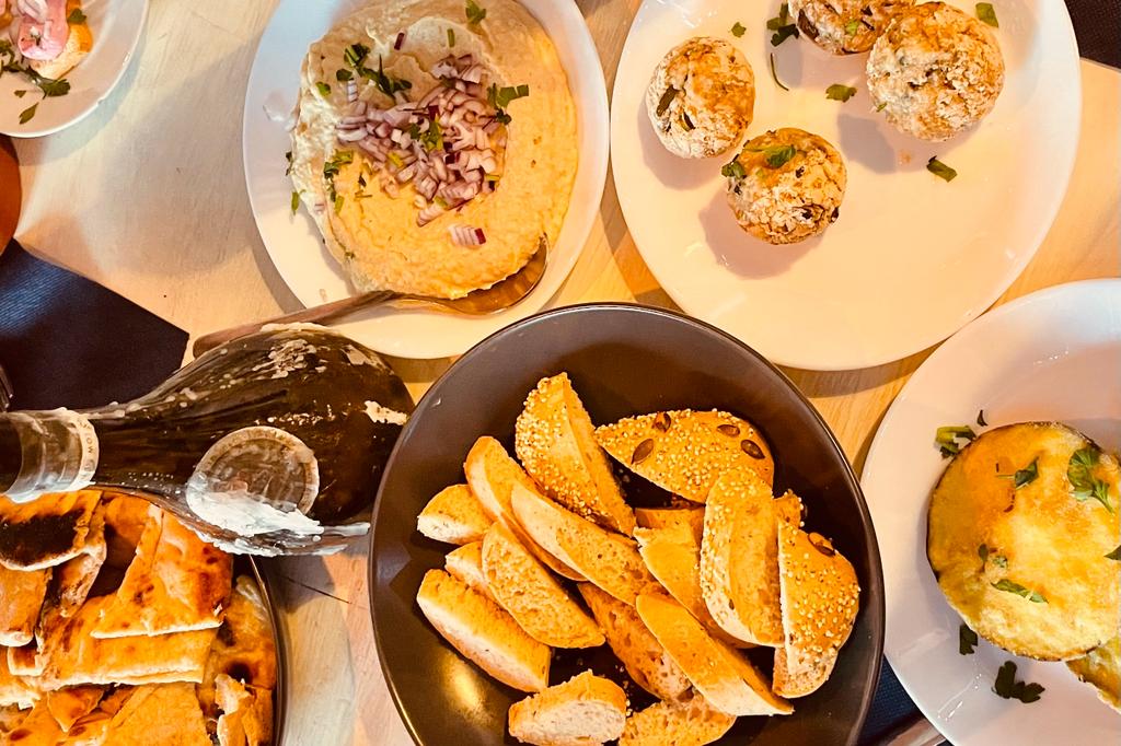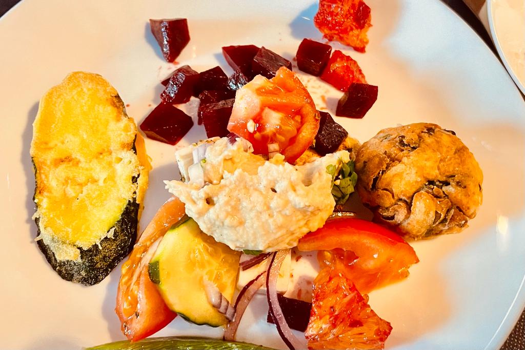 Tzatziki, Hummus ( v,gf ), Falafel, Beetroot orange salad ( v,gf ), fry vegetable ( v,gf ), Taramosalata , Smoked mackerel , Greek salad ( v,gf ), Spinach pie (v), Cheese pie with honey and sesame , stifado with soya (v), Stifado with mushrooms ( v,gf ), Kebab with black pork . And chocolate mousse ( v,gf ). And ouzo 😊