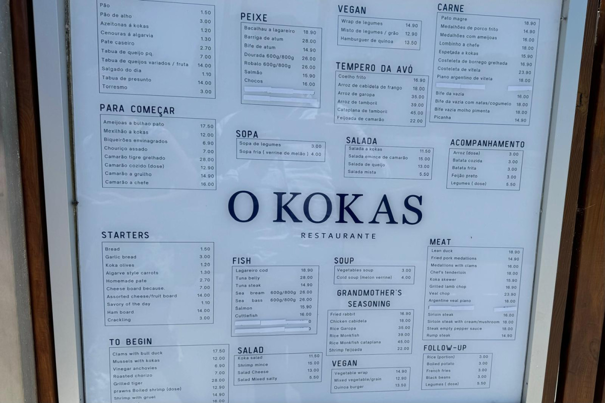 The menu of O Kokas features delicious authentic Portuguese dishes. There are fish options and meat options.