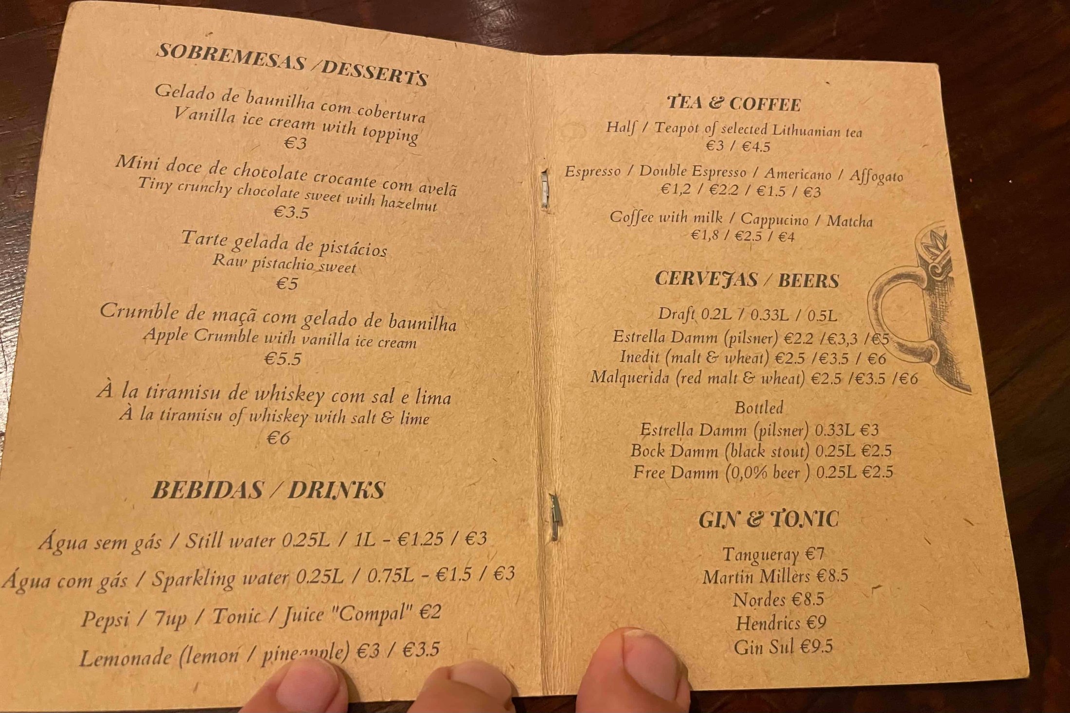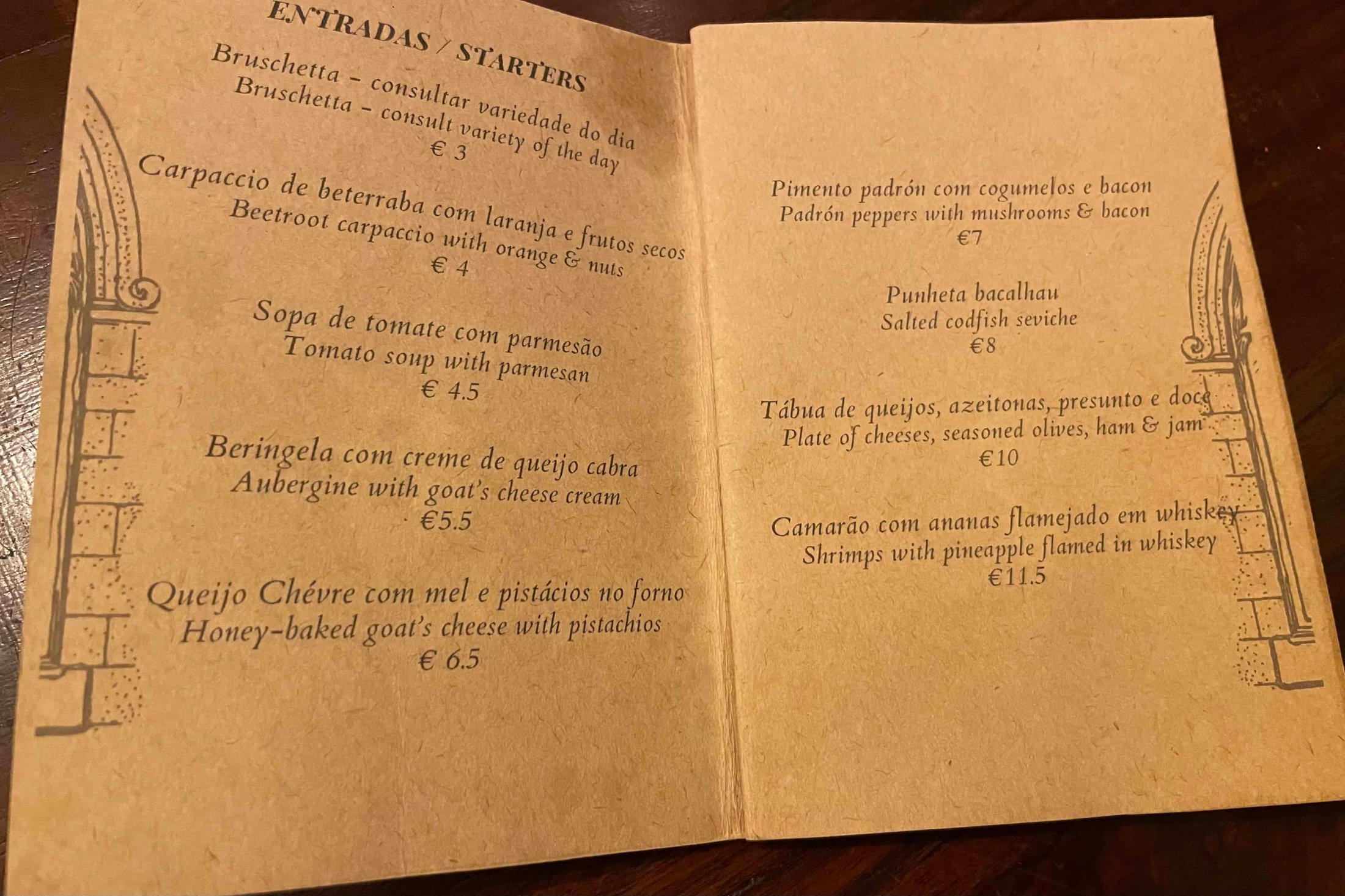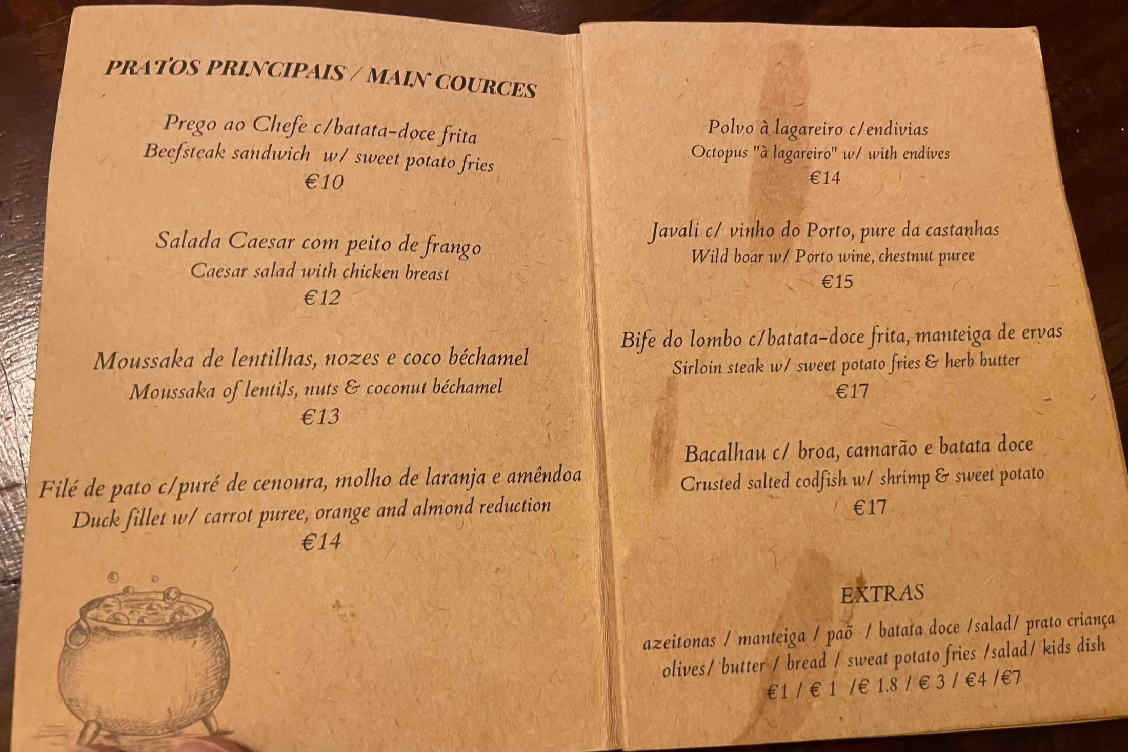 The menu offers many starters, such as salt cod and shrimp with pineapple and mushrooms with green pepper and bacon. The main courses are duck fillet with oranges, wild boar with port wine. The prices are from 12-17 euro.