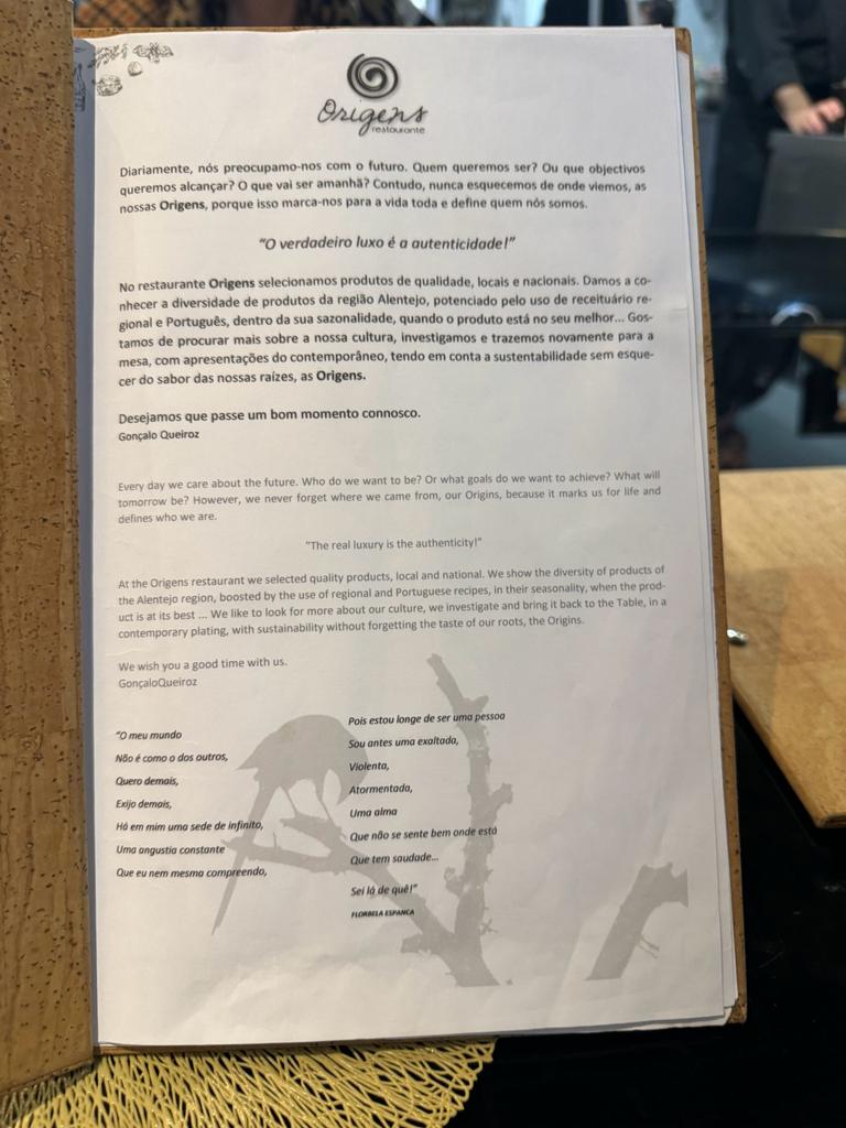 What sets Origens apart is its commitment to using only local and seasonal ingredients, emphasizing sustainability and the rich flavors of the Alentejo region.