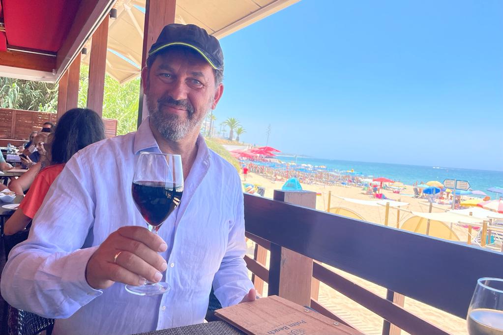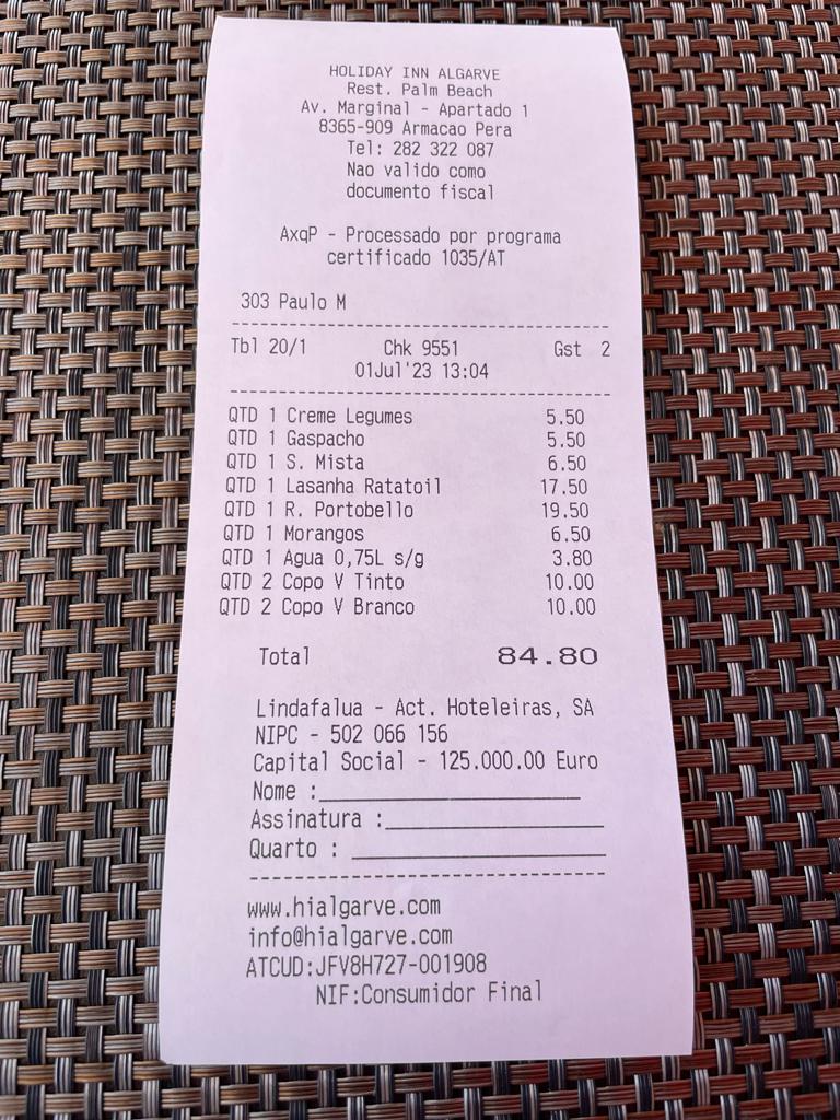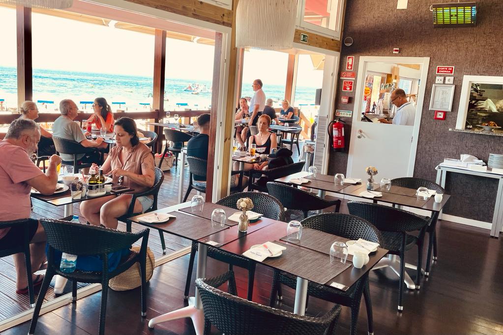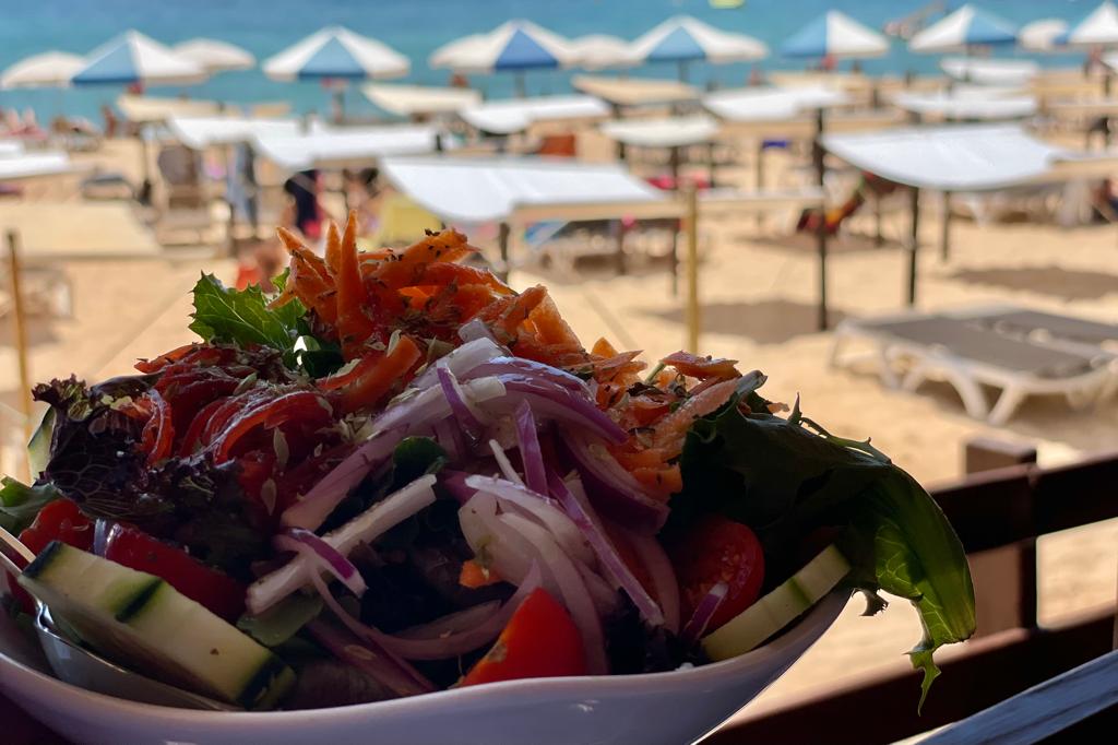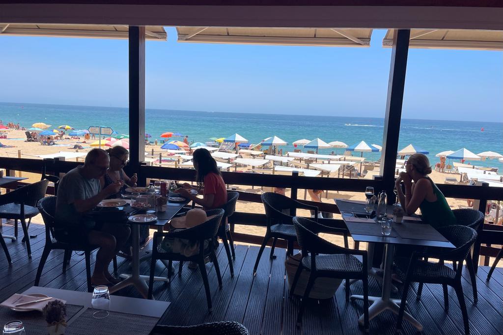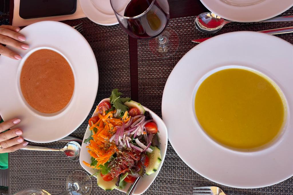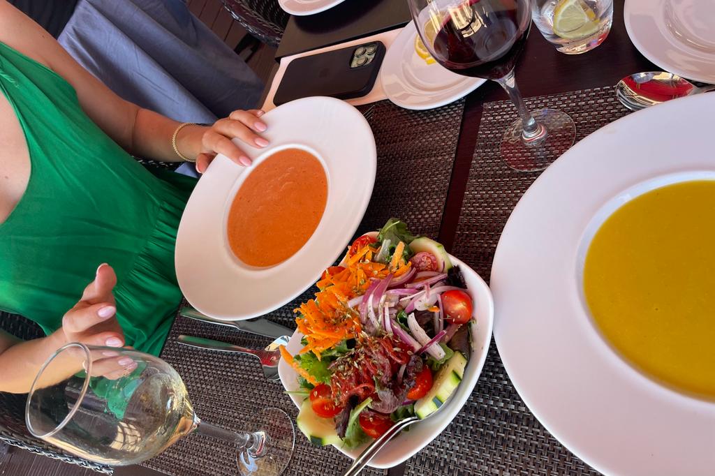 We began our meal with a delightful glass of wine and a bottle of refreshing Monchique water. As we enjoyed our starters—gazpacho, vegetable soup, and a vibrant salad—we soaked in the beauty of the beach surroundings and watched Elyas play.