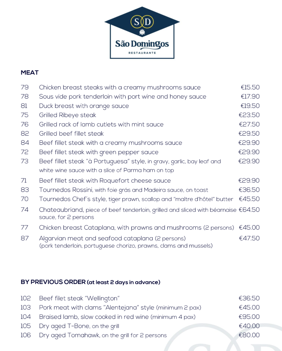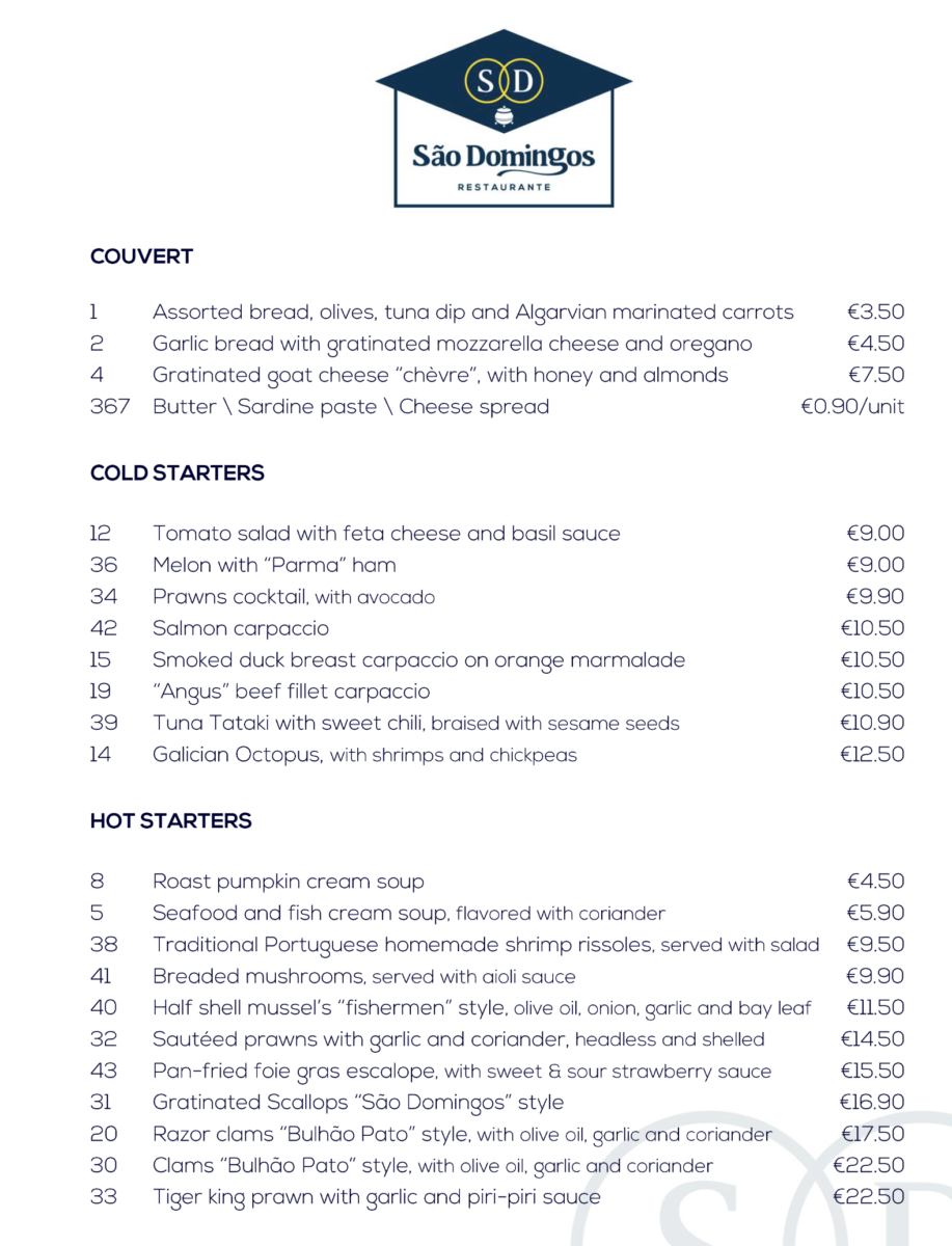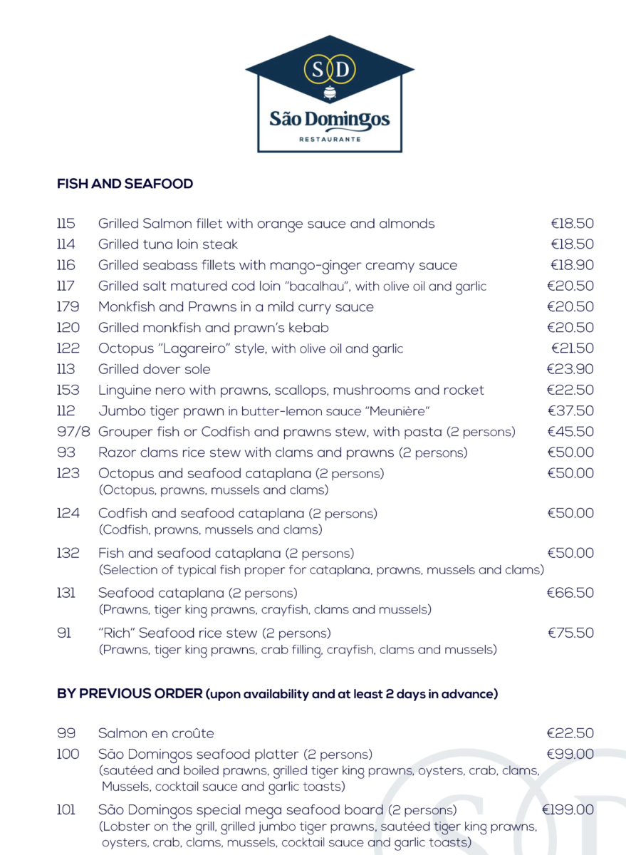 Lunch options range from Tuna Salad (€8.50) to Hamburgers (€6.50), and hearty main courses include Grilled Chicken (€13.90), Tuna (€14.50), Swordfish (€14.50), and Rumsteak (€17.90).