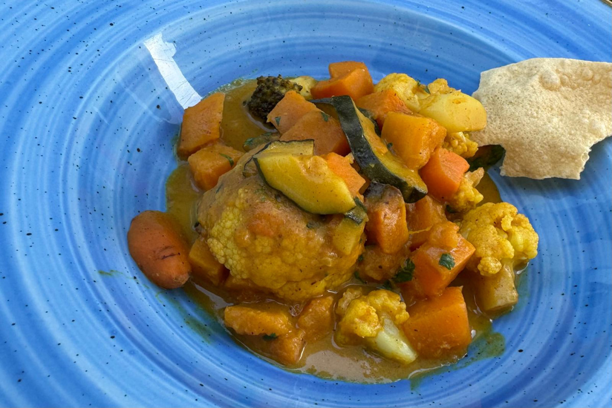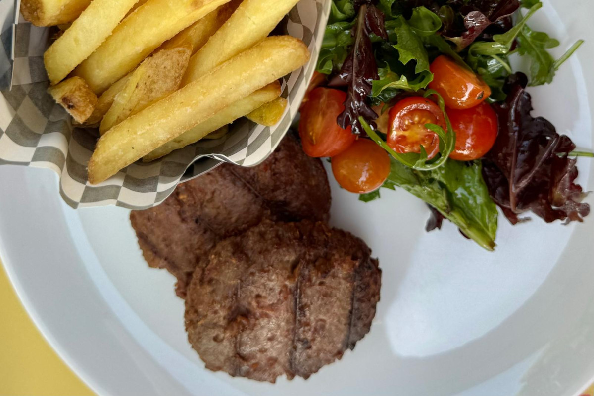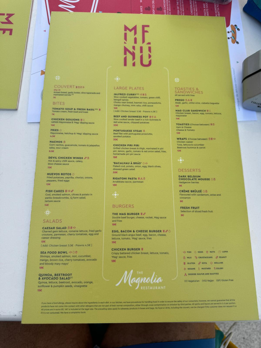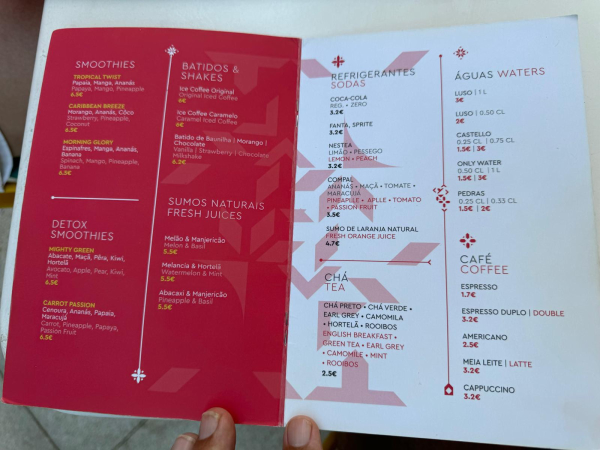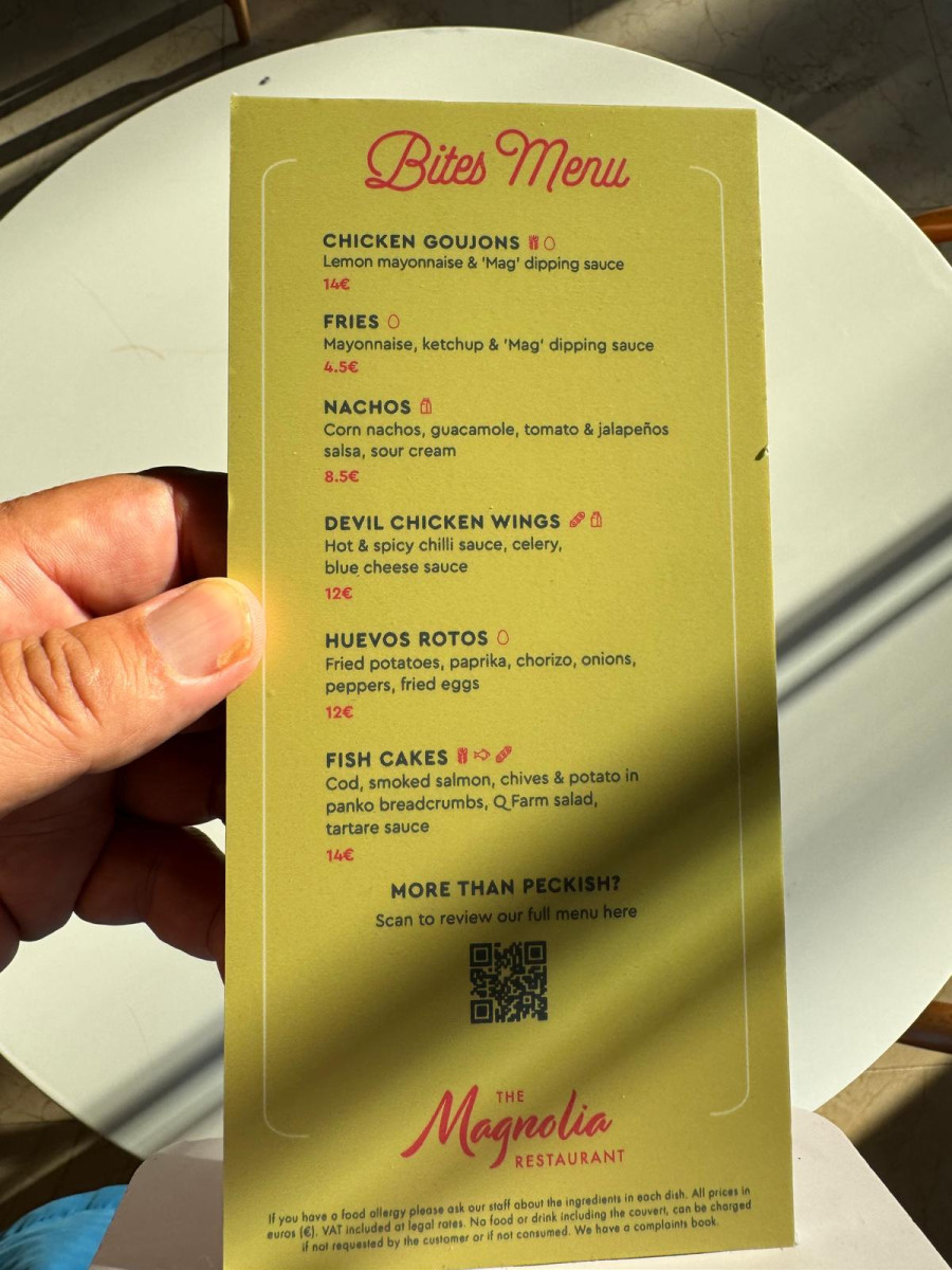 The menu is simple yet varied, offering several vegan options, perfect for a casual meal. You'll find classics like the Caesar Salad (€15), the refreshing Beetroot Avocado Salad (€15), the Chicken Burger (€18), and the Double Beyond Burger (€17). House wine is priced at €7 per glass, while fresh juice costs €4.70. All prices are on the higher side considering the accommodation.