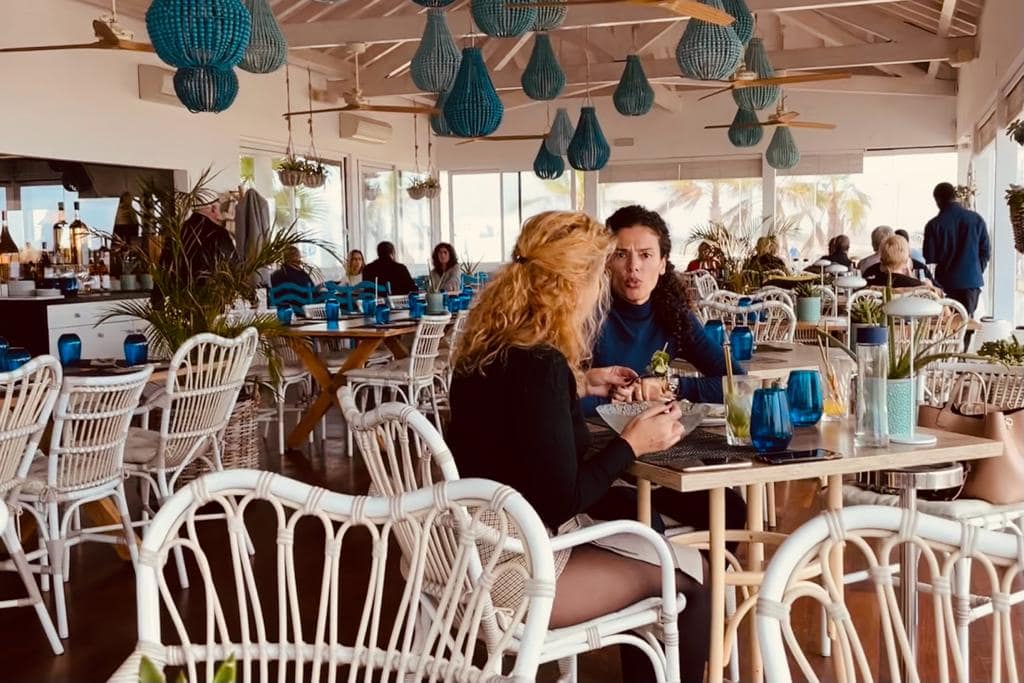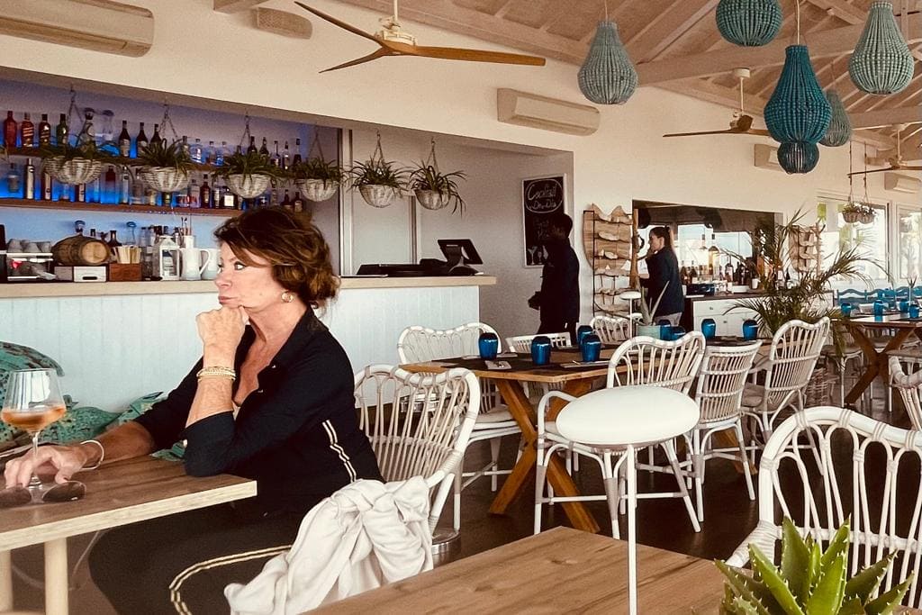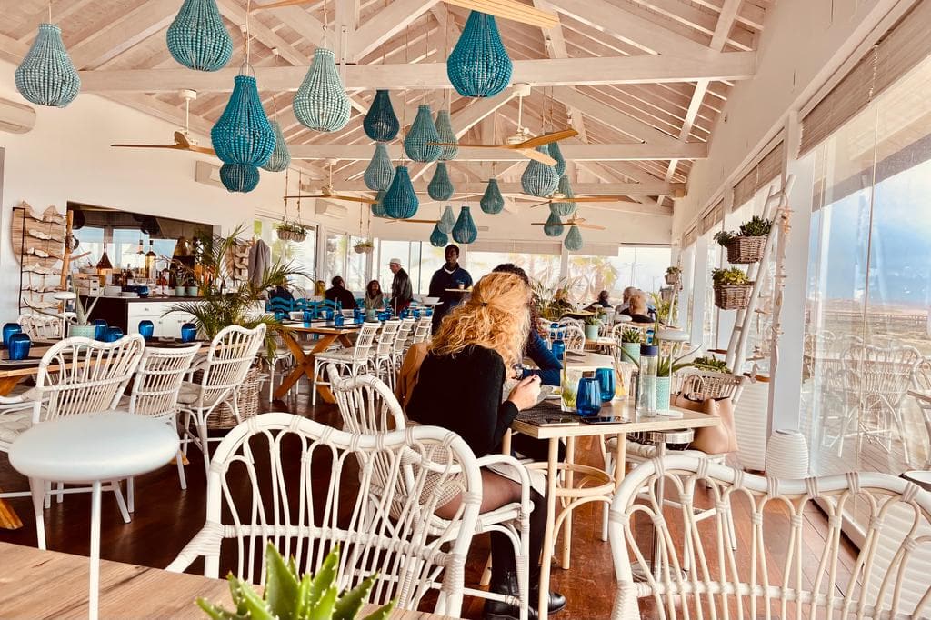 When you enter the restaurant looks very nice and tastefully decorated with white washed interior. You have a beautiful view of the sea, and above you can see what the chefs are cooking through a glass wall. Also suitable for children. ( and I think dogs are allowed too). In the summer you can relax on the beds on the beach. And are there good DJs like Ronaldo's ex…