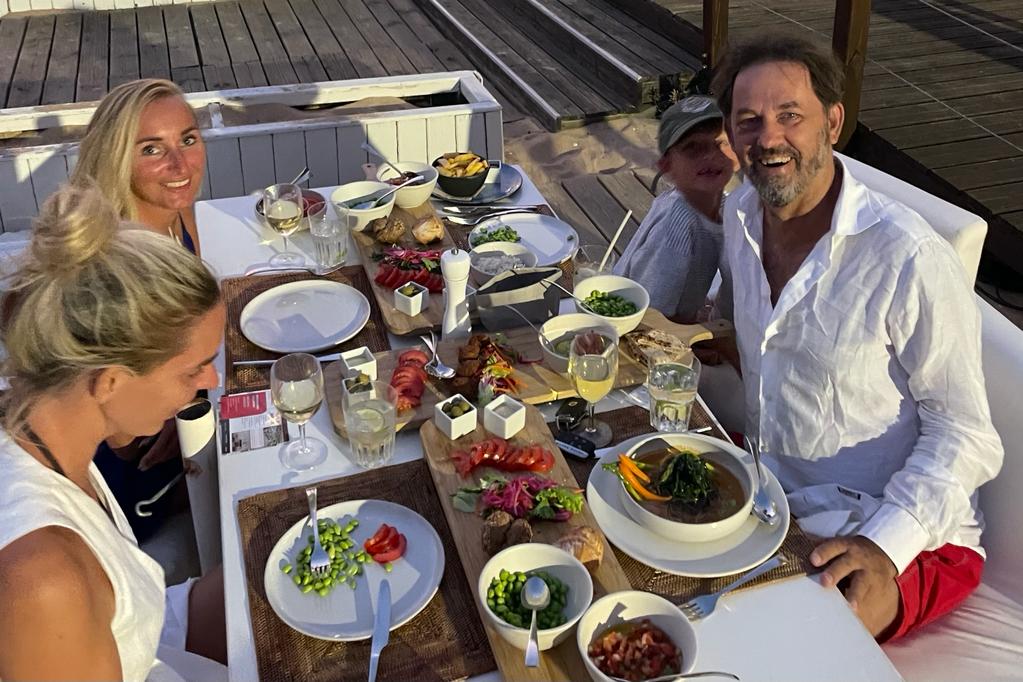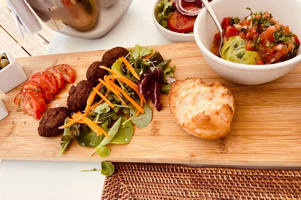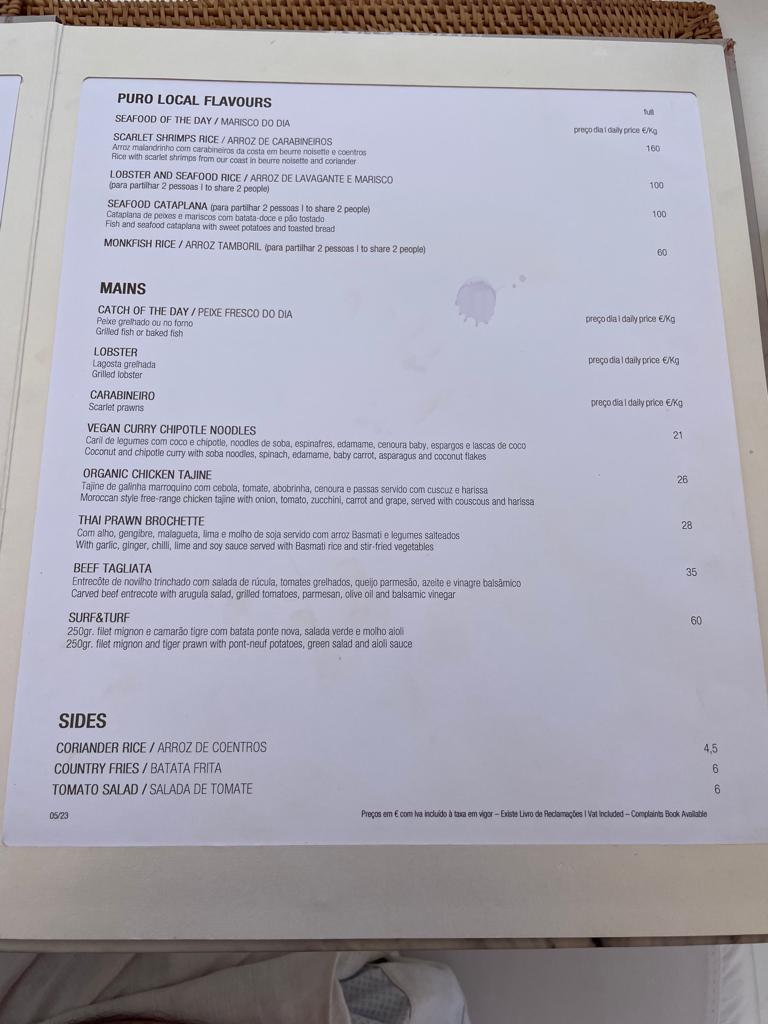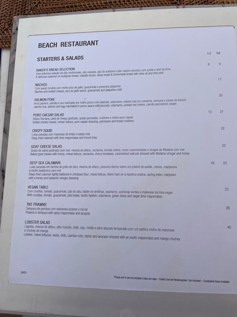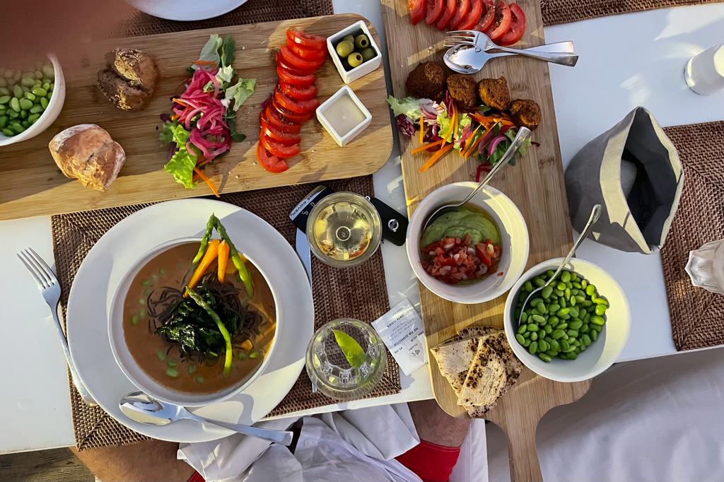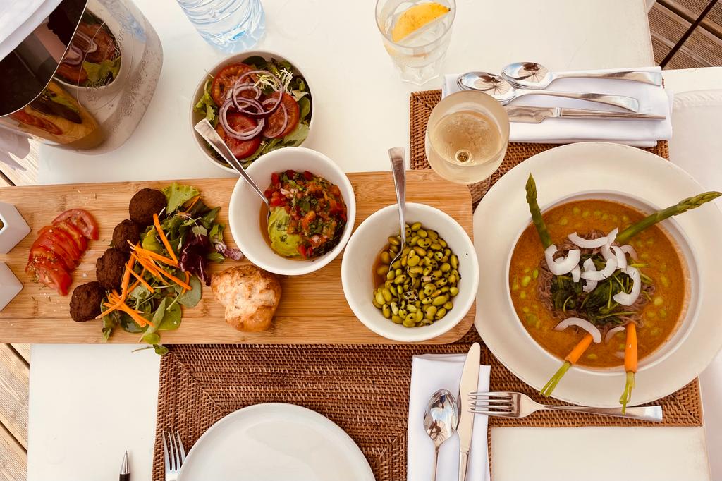 We decided to start our beach lunch with a delightful bottle of white vegan wine. Although our initial intention was to order a glass, our charming waiter convinced us that a bottle would be the perfect choice. He accurately predicted that we would savor more than a single glass, and he was absolutely right.