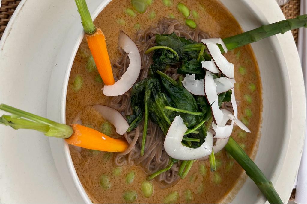 As for me, I indulged in a curry with noodles (also available gluten-free), accompanied by edamame, carrot, asparagus, and coconut shreds—an absolute delight for the taste buds.